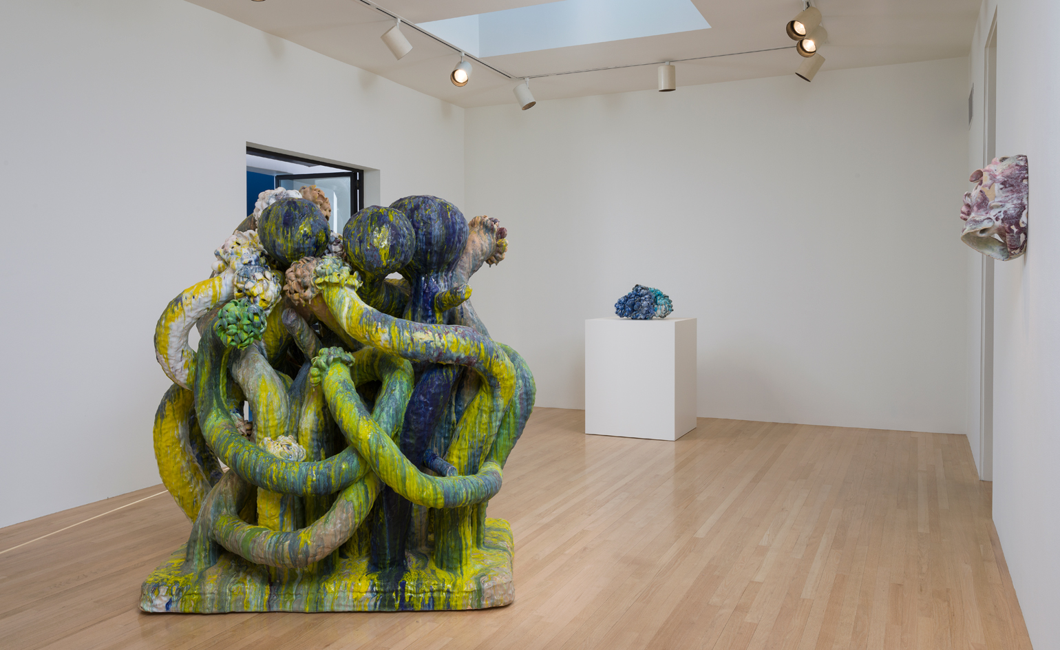 Those abilities have strengthened over the past few years, most ambitiously in 'Peaceable Fruit' a new solo exhibition at Venice's LA Louver gallery (on view until 30 December). Inside the two-storey, beachside space Wedel has installed more than a dozen of his massive flower trees (rendered in ceramic, porcelain and stoneware) which range in size and weight from a 40 lb blue tabletop sculpture of scalloping flowers to his explosive 1,900 lb, sherbet-bleeding Banana tree whose 'tumorous fruiting' lies on the ground of this tentacular plant beast. It's all meant as a dystopian nod to the Garden of Eden and the Peaceable Kingdom paintings of American folk artist Edward Hicks.