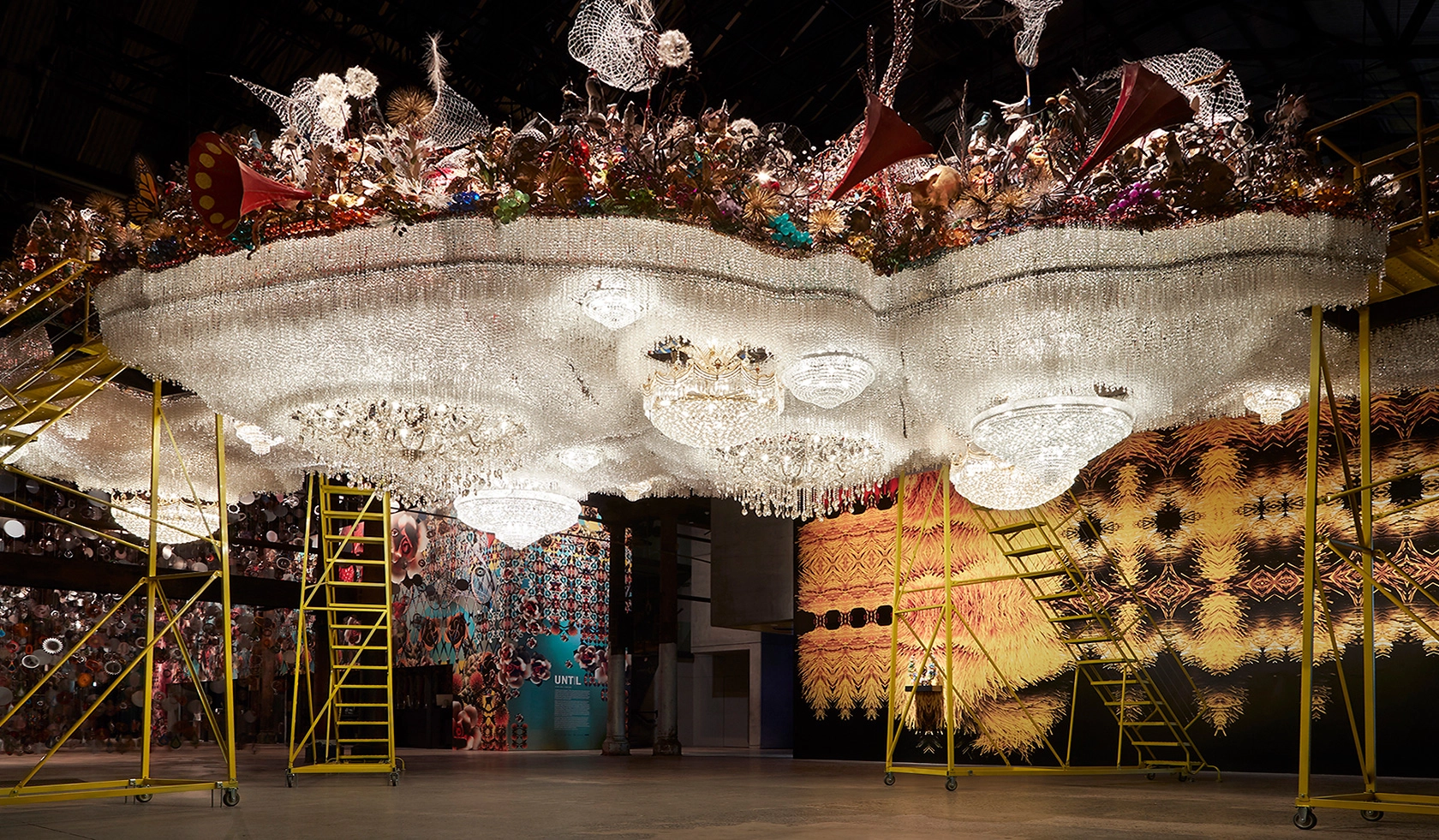 Dwarfed under a five-tonne crystalline cloud dripping with glowing chandeliers and cascading beads, a sense of magical awe suspends your imagination. Twelve metres long and six metres wide, it forms the centrepiece of American artist Nick Cave’s Until, a monumental, multifaceted installation occupying just over 1,700 sq m of Sydney art space Carriageworks. His fantastical landscapes require journeying up steps to menagerie wonderlands, weaving through forests of twirling wind chimes, channeling through a tunnel of kaleidoscopic curtains intricately woven with plastic beads and immersion within kinetic Rorschach patterns.