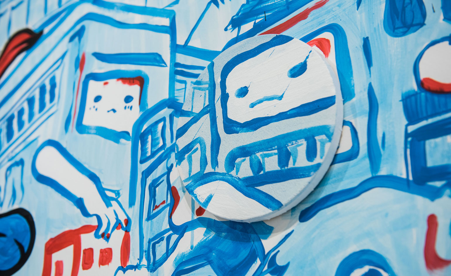 Self-taught graffiti artist Bao worked with Hadrian Lam, Felipe Wong, Anny and Uns to create two large murals that take inspiration from the red, white and blue colours of the gallery's neighbourhood