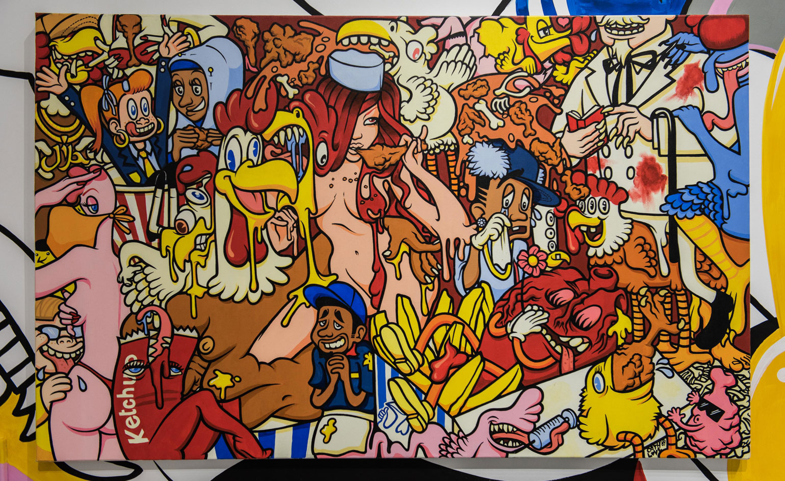 The gallery's ground floor and glass facade present a diverse range of murals and paintings; upstairs, a video documenting the creative process of turning the gallery into a street corner forms a further part of the exhibition.