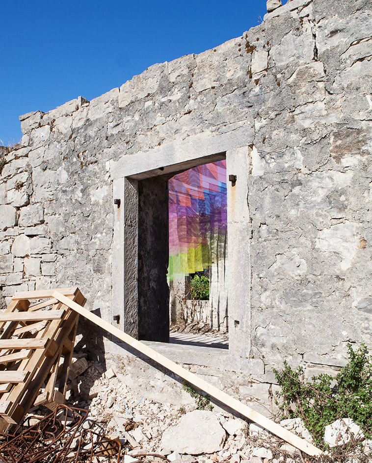 The German artists have suspended their installation in an abandoned stone building in the village of Kagkatika. Mesh-like fabric has been spray-painted in 120 different shades, creating a kaleidoscopic, digital pixel-like mirage. Each layer becomes larger and more prominent as visitors walk towards the centuries-old stone windows that form the backdrop to the artwork.
