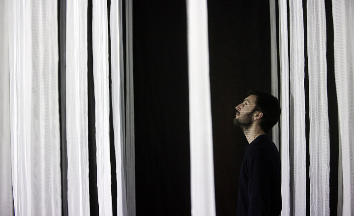 3Destruct' by AntiVJ. Using 3D projection mapping technology, the artists presented moving images on thin strips of fabric panels, suspended from the ceiling and accompanied by an eerie musical score