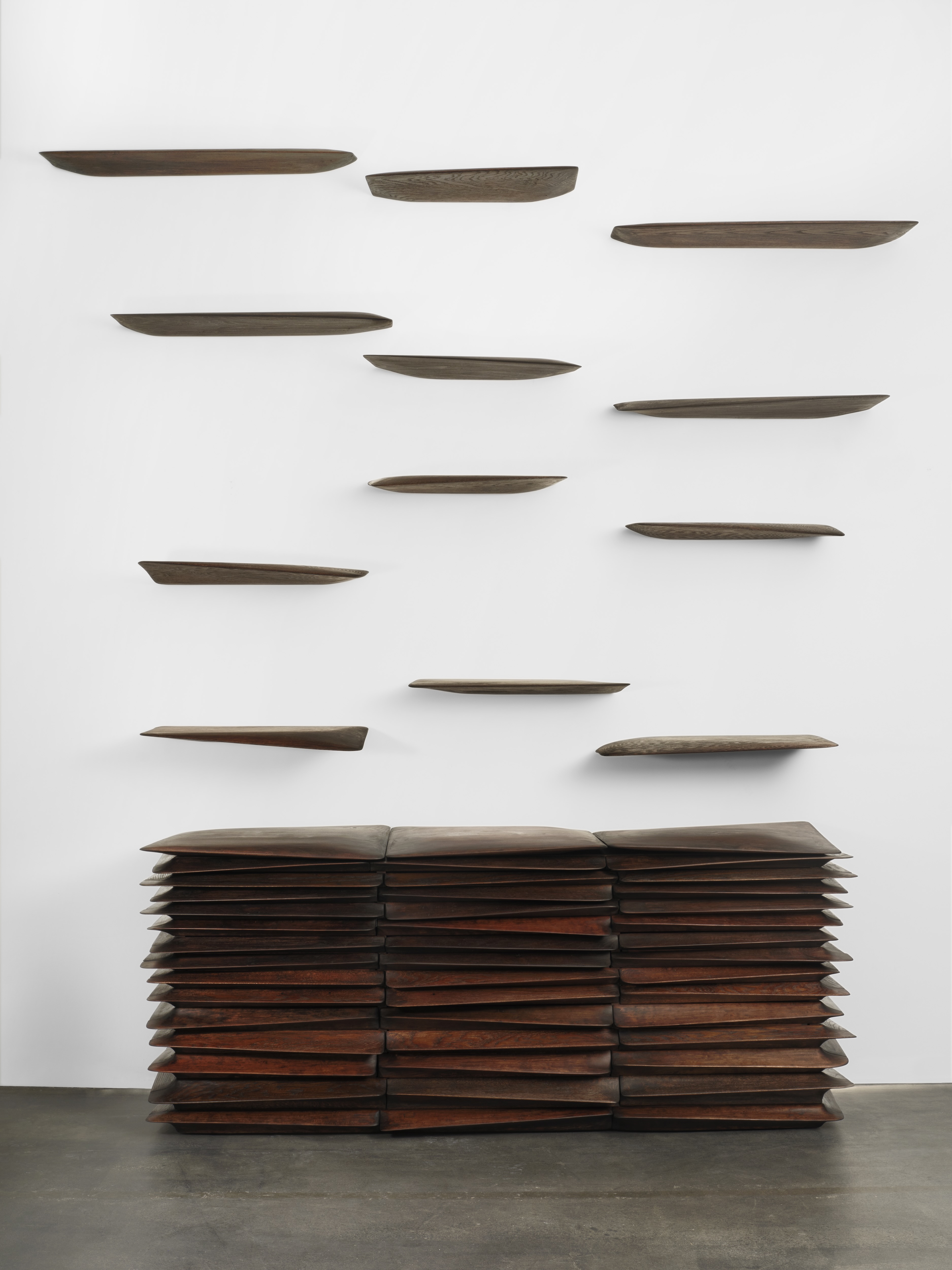 The Myerscough booth was a trove of exquisitely crafted pieces: ethereal glassware by George William Bell, based in Monterey, California, and massive, driftwood-like dome lights by British artist and maker Nic Webb. Two concepts – nature and nurture and the perfection that arises from imperfection – came together in the monumental split-log ‘Cleft’ cabinets by another Brit, Peter Marigold, in his continuing collaboration with Tadanori Tozawa's Japanese woodworking shop Hinoki Kougei. The ‘Sheets Credenza’ and the sculptural shelves that float above it, by American (and former Martin Puryear studio assistant) Christopher Kurtz, were as clever as they are exquisitely crafted. The stacked shelves appear to be merely sculptural shims until they open outward to reveal drawers. Equal parts art, artisanry and design, they float on the wall like magic.