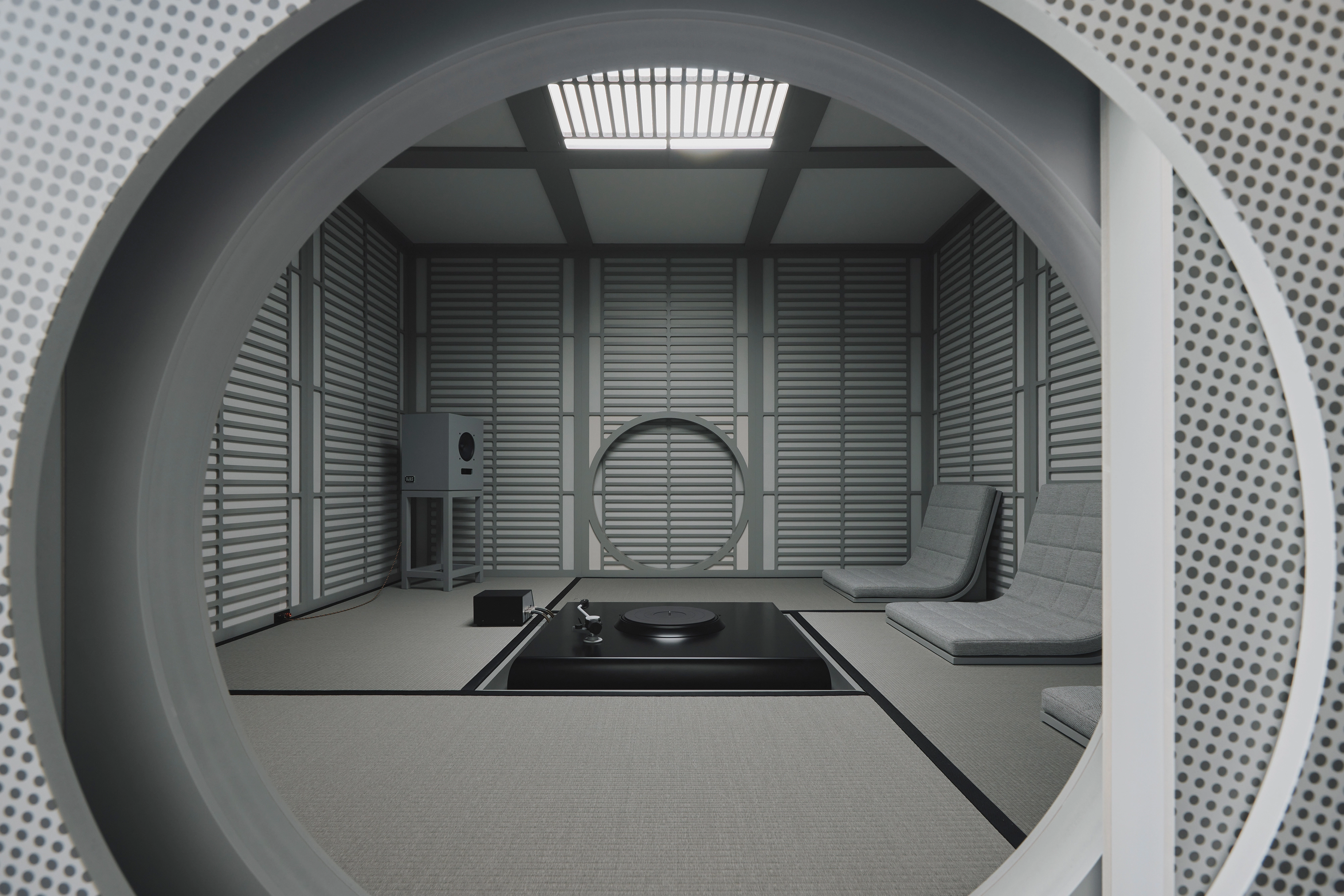 Beyond the space's small round doors (a reference to the nijiriguchi of a traditional tea house), an oversized matte black turntable takes centre stage. At one end of the small room sit two speakers, and at the other end, three low chairs invite guests to focus their attention on listening.