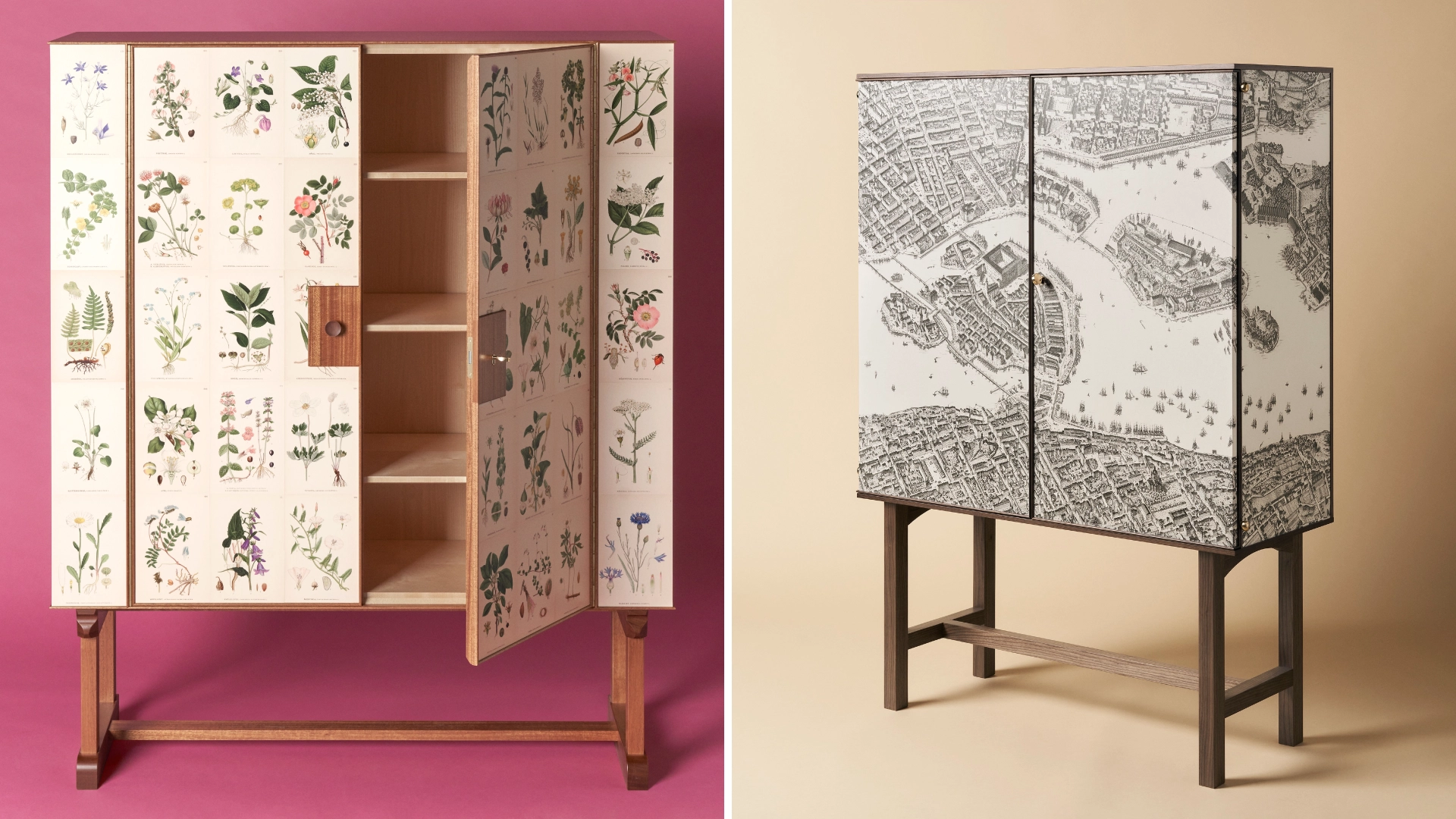 ‘Cabinet 852, The Flora Cabinet’ (1937-1938) draws inspiration from Ericson’s visit to the home of Swedish biologist Carl Linnaeus; reintroduced for Svenskt Tenn’s centenary, it features 115 hand-applied botanical plates. ‘The Stockholm Cabinet’ (1930-1950), also reissued for the centenary, showcases a detailed 1875 map of the city. Both are produced by Anders Mattsson Cabinetworks.
