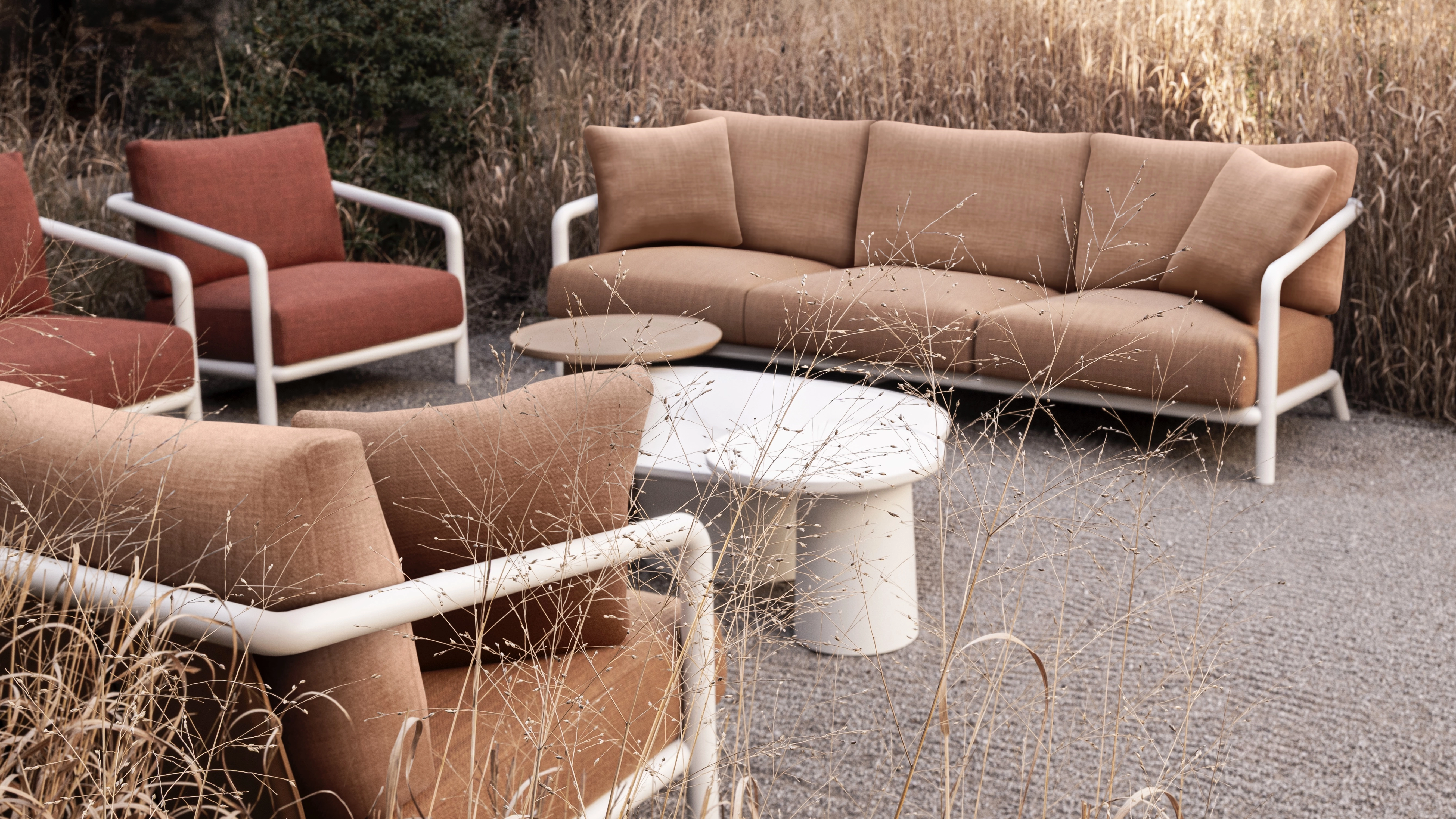 The ‘Soleva’ sofa, available in two- and three-seat versions, combines supportive comfort with refined posture. Its rounded tubular aluminium frame is matched with vertical marine plywood slats in ‘Olive Green’ or ‘Siena Brown’, coordinated with ‘Selva Green’ or ‘Nuvia White’ structures. Cushions feature recyclable polyurethane inserts and water-repellent covers, while optional loose armrest cushions add flexibility.