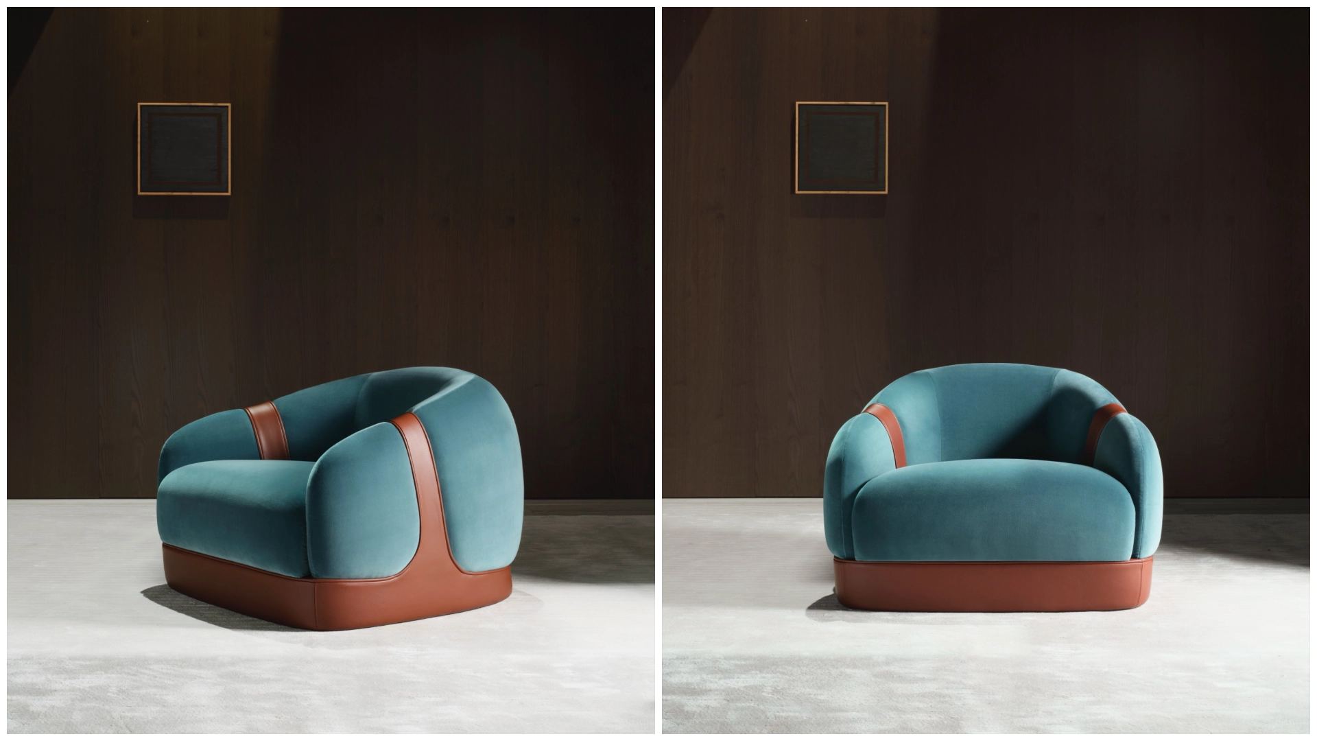 The chair’s volumes are imagined to embrace the body, an effect enhanced by the material composition of the design. ‘Material was present from the very beginning,’ observes Mohaded, explaining that the two elements were essential for his concept to come to life. ‘Leather had to be present as that symbolic “corset”, more rigid, and from there we were able to enter into dialogue with a softer, complementary textile. Without being excessively complex, the beauty of the piece lies in the quality of its details: the leather craftsmanship, the stitching, and the joints, something in which Molteni especially excels.’