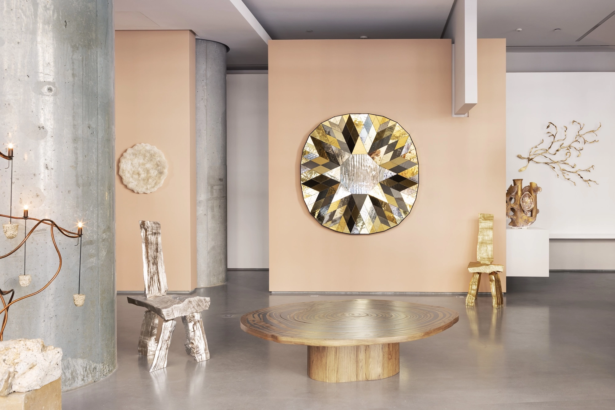 New works drawing attention include artist Sam Orlando Miller’s large-scale mirror with geometric complexity. Francesco Perini displays oak-and-quartzite fused furnishings guided by Tuscan marquetry techniques, while ceramicist Johannes Nagel showcases fresh pieces in glazed gold and lustre fired directly onto the ceramic.