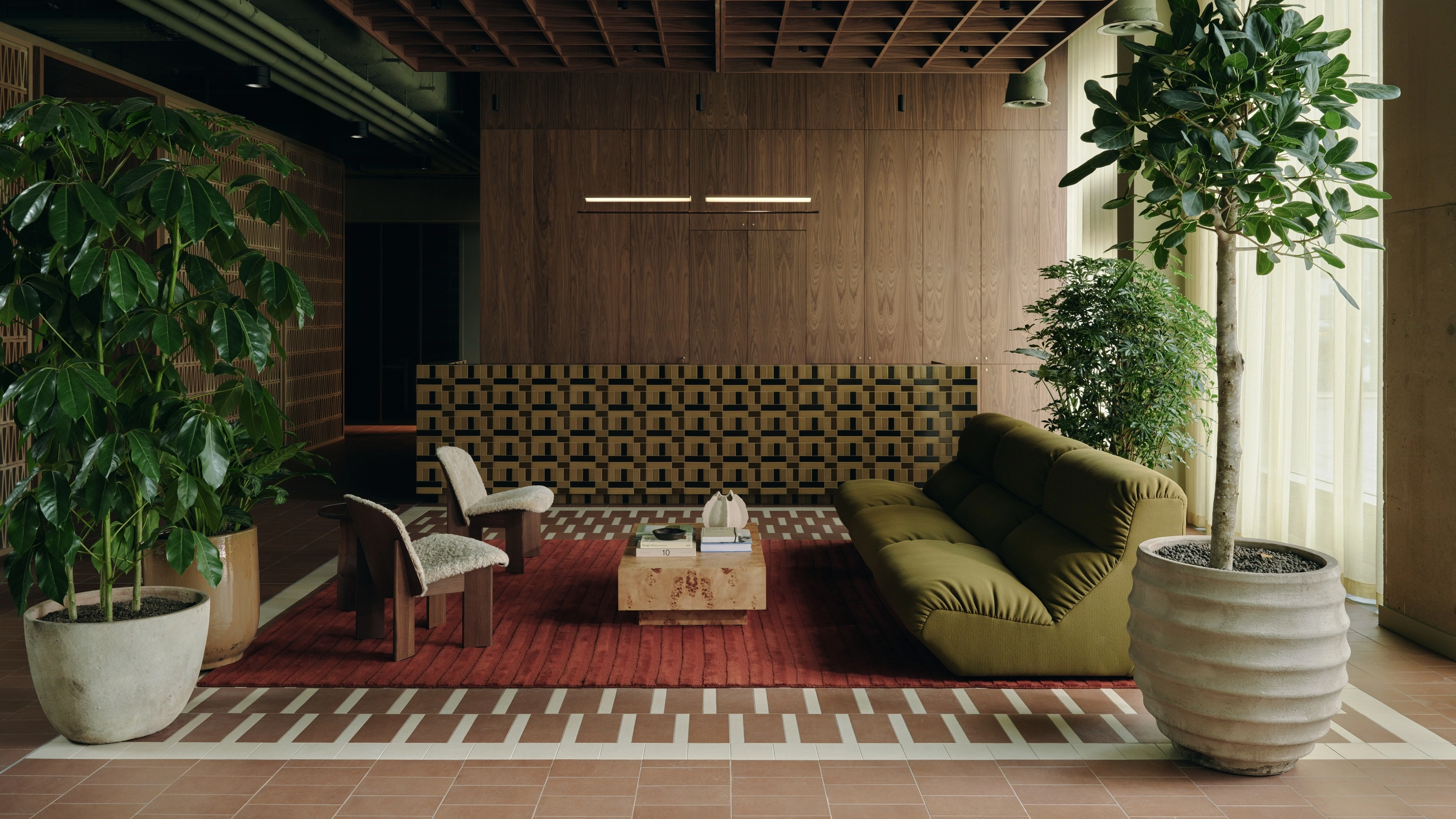 The reception area introduces this language through terracotta and warm white ceramic tiles arranged in alternating brick and block formations. The reception desk is clad in volcanic ash glazed tiles in varying shades of ochre, while furniture selections reinforce the hospitality-led ethos: soft sofas and lounge chairs, textured rugs and burl-wood tables.