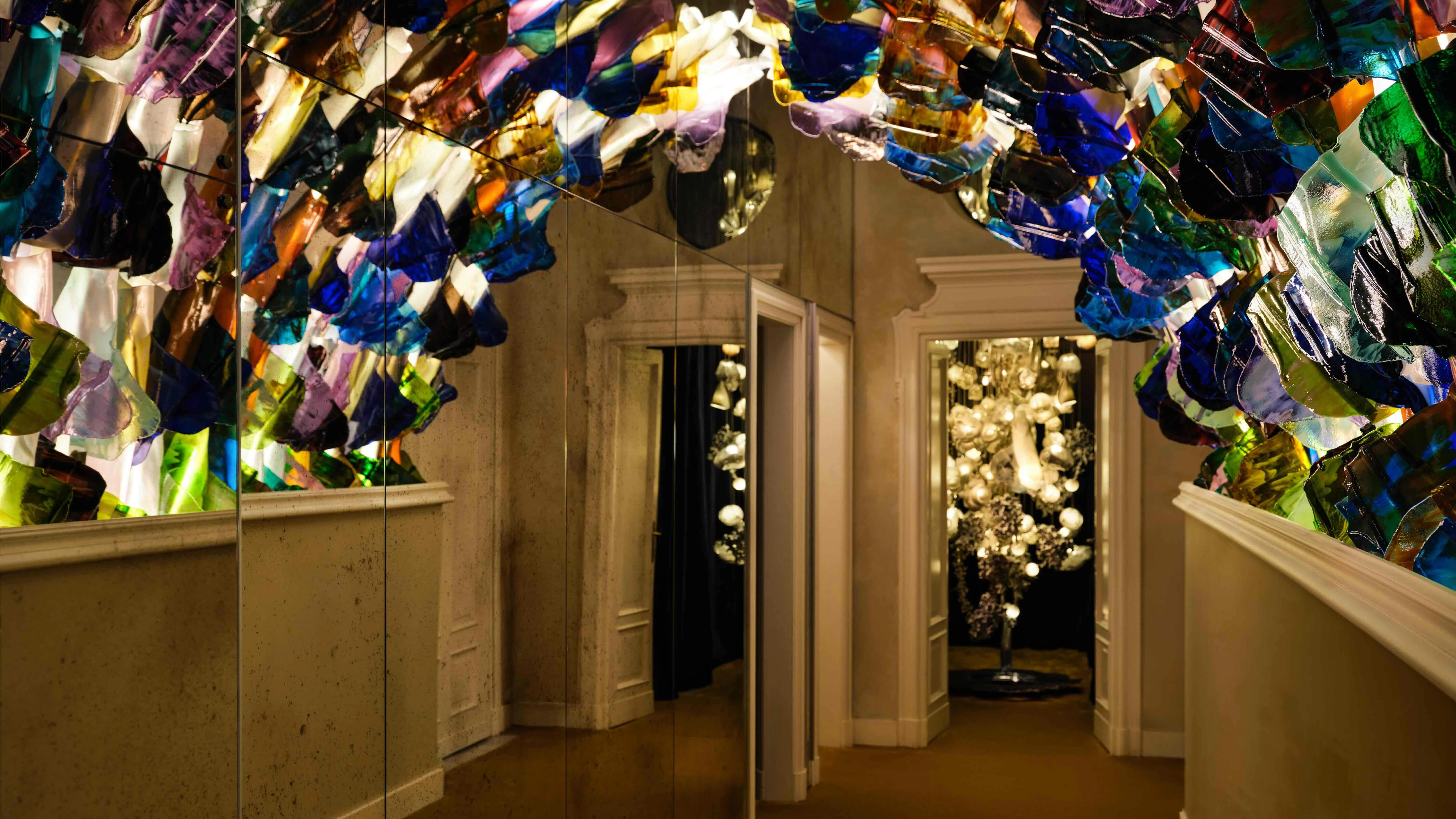 For the occasion, the residential space has been transformed into a sequence of immersive encounters, where sheet and hand-blown glass forms glow in the darkness like planets in a night sky, cascade from the ceiling or are arranged en masse to spellbinding effect. ‘My role is to offer some sort of poetic interference – thickening the atmosphere, as it were, so it catches the light in a particular way. It has a mysterious impact on people’s emotions, light does.’