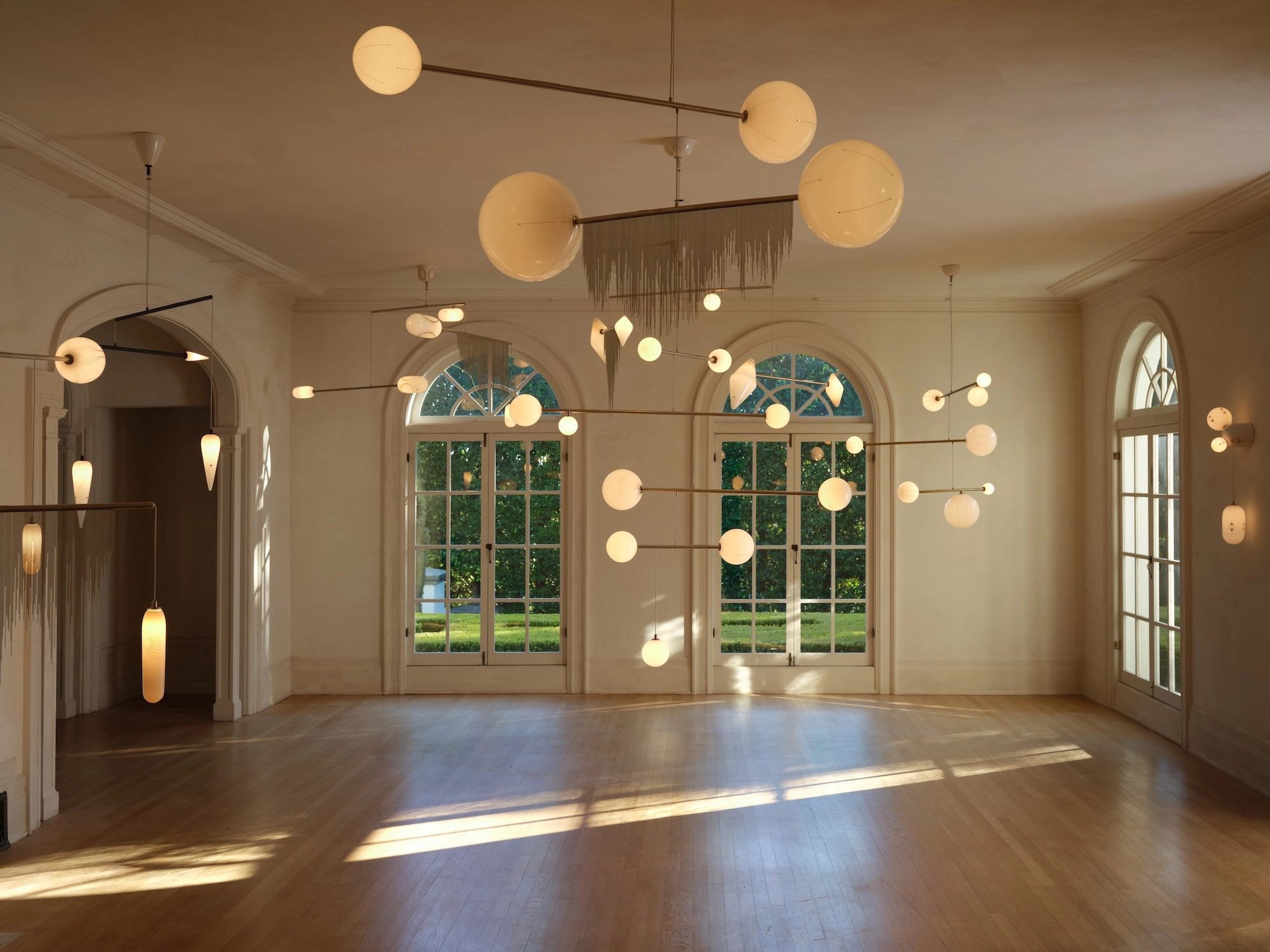 Some mobiles have delicate, jewellery-inspired chain fringes; others have crystals delicately balanced on horizontal elements. ‘A lot of them are for protection or to encourage intuition,’ Adelman explains of the glittering minerals. As with ‘Andromeda’, the designer created miniature models with string and tape to resolve the balance of each piece. Once installed, each chandelier unhurriedly rotates as unseen breezes blow across it.