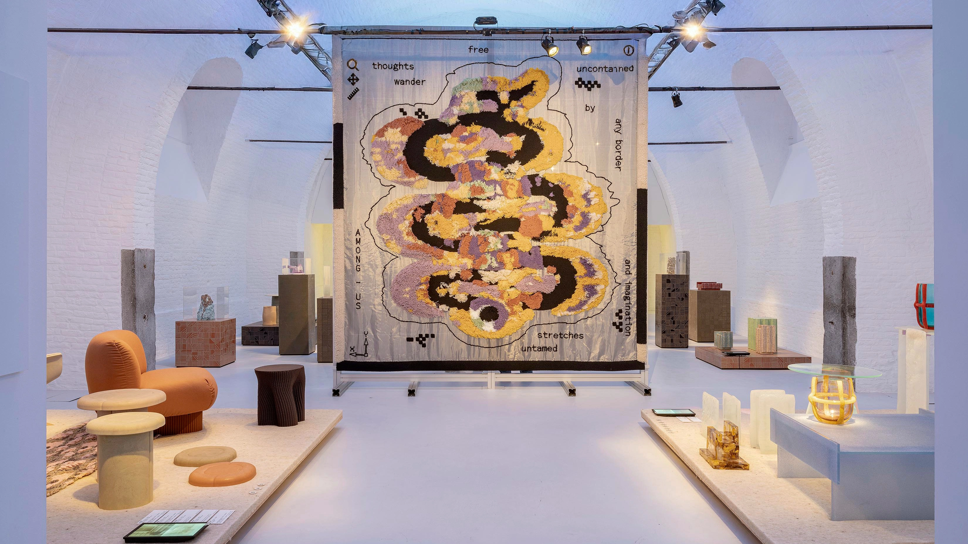 The scenography leans into Urquiola’s more imaginative impulses. Hybrid creatures, marine forms and fantastical details appear across rugs, stools and surfaces, highlighting a personal visual language that is brought into sharp focus by the exhibition format.