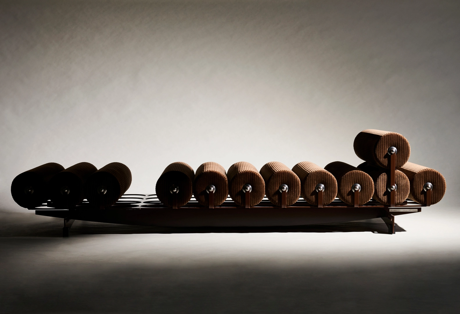 The boldness of Töll’s designs comes from a composition of primal forms: cylinders and metal bars intersecting with rigorously cut silhouettes, resulting in furniture that is both provocative and purely functional. His work was noticed by Stone Island, which approached him to create a piece for the Shanghai flagship. ‘When I saw the floor plan, I noticed the proportions didn’t fit their initial idea, so I proposed a new version.