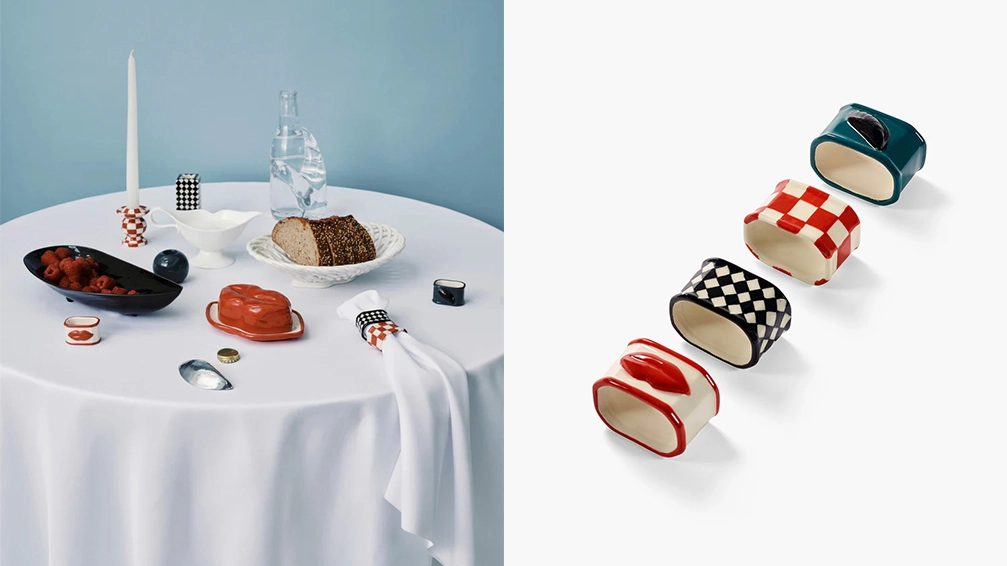 This surrealist-inflected quartet of ceramic napkin rings brings visual intrigue to the table. Featuring two checkerboard patterns, sculpted lips and a mussel motif, the set reflects Wouters & Hendrix’s flair for whimsical, thought-provoking design.