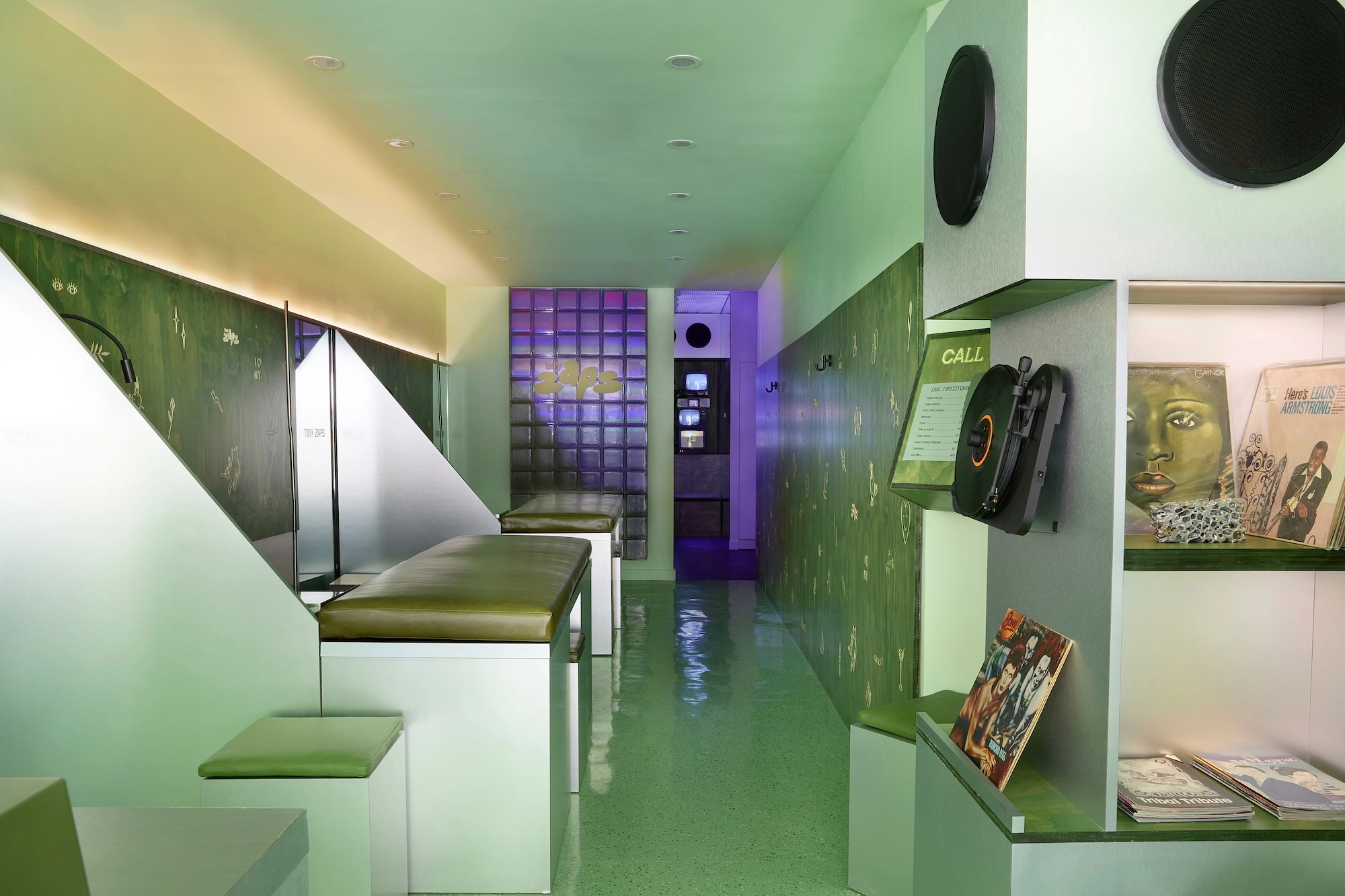 Blending futuristic vibes with nods to bygone eras, Tiny Zaps’s new Brooklyn tattoo parlour feels fresh yet familiar. The monochromatic green, 500-square-foot space in Williamsburg is far from a traditional tattoo shop. The former bodega is now a hangout spot, where anyone can indulge in a tattoo ritual. Beyond specialising in micro tattoos, the studio offers a bright, serene atmosphere where little comforts and entertaining reassurances guide tiny tattoo seekers through the process.