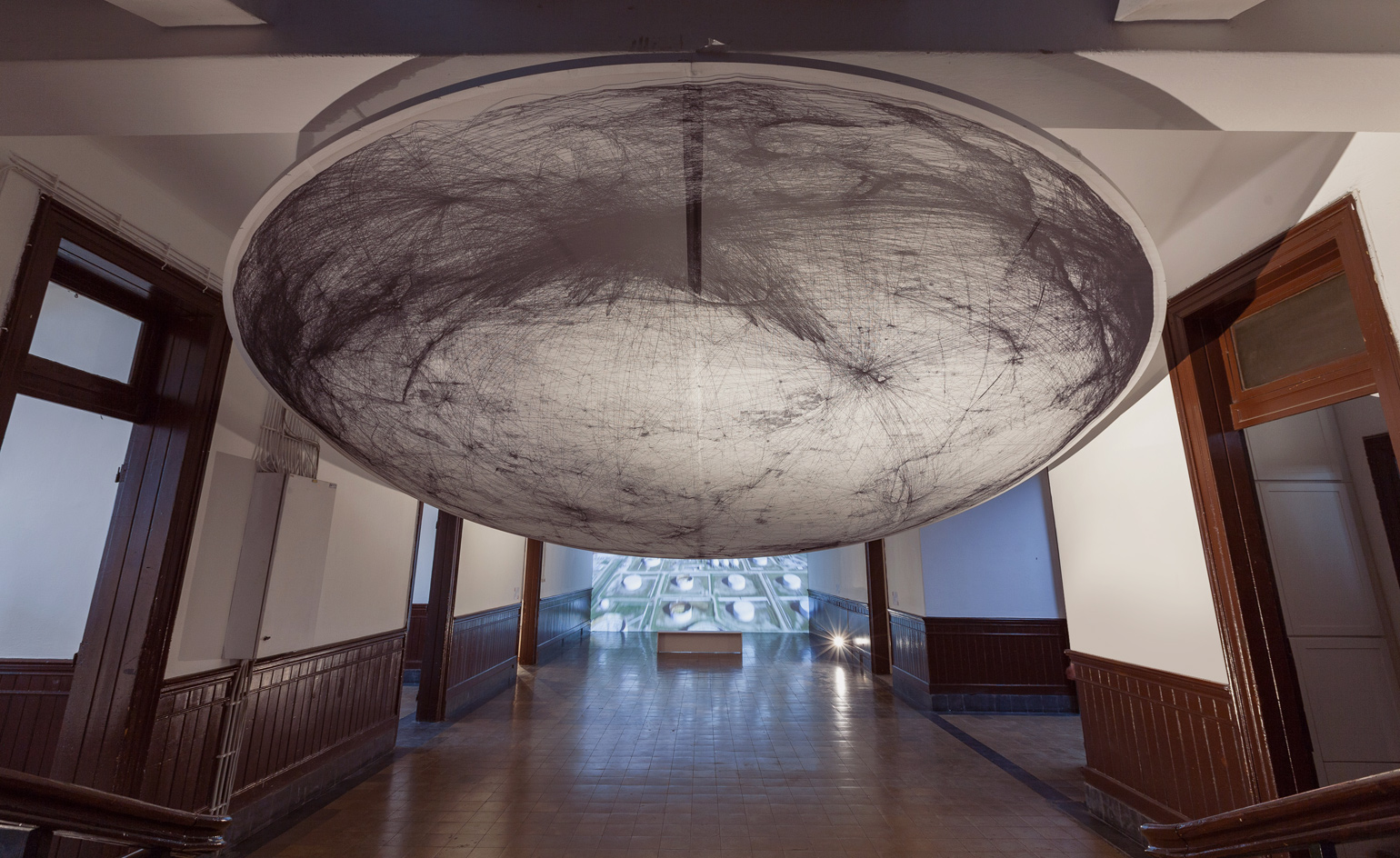 ‘We live inside design like the spider who lives inside the web that it’s constructed from it’s own body,’ explained Mark Wigley at the show’s opening. Nowhere was this better demonstrated than within Joyce Hsiang and Bimal Mendis’ ‘City of 7 billion’ where two vast web-like drawings suspended from the ceiling chart the traces of roads, shipping lanes, flight paths and submarine cable across the globe.
