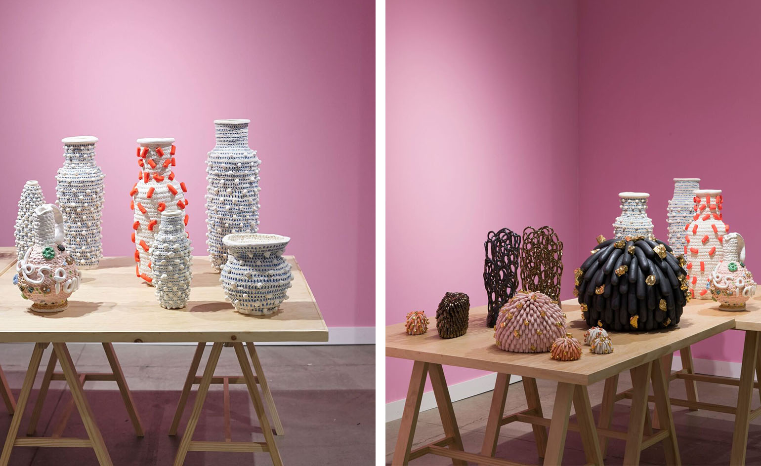 Mindy Solomon Gallery featured ceramic works from Glenn Barkley and Linda Lopez against a brilliant pink backdrop. Photography: Scott Rudd. Courtesy of Collective Design