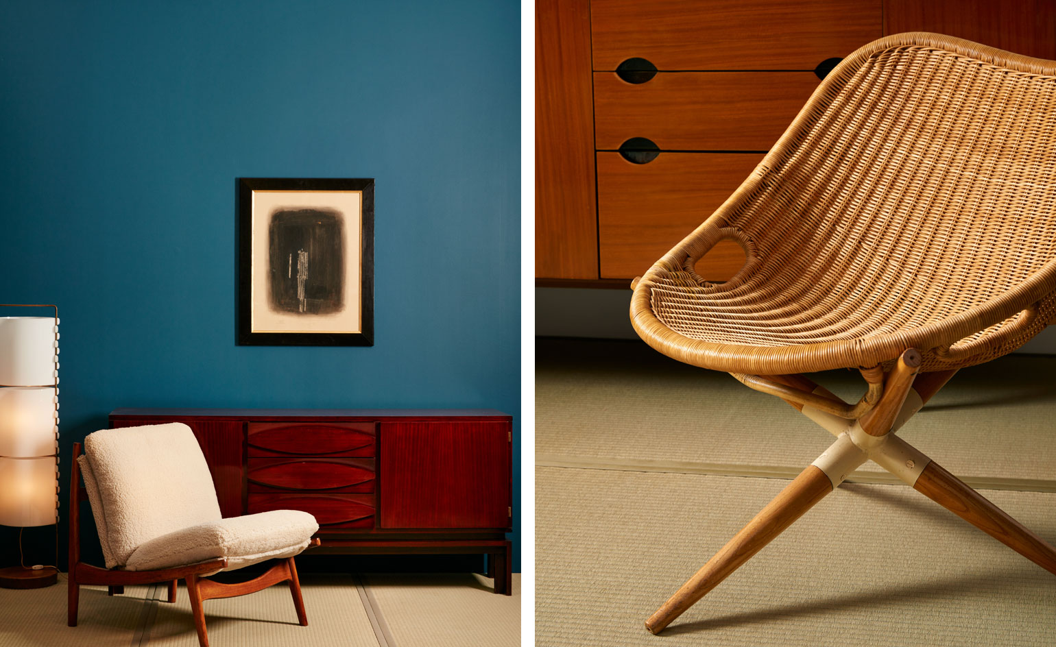 There’s a heavy emphasis on the materials used, as evidenced by Joseph-André Motte’s rattan tripod chair, and ash and mahogany daybed, which fill the second space. And finally, a rendering of a typical French apartment reimagined in Dumond’s pieces. As a glass coffee table unexpectedly sits next to a plaid sofa, minimalism still has the potential to surprise.
