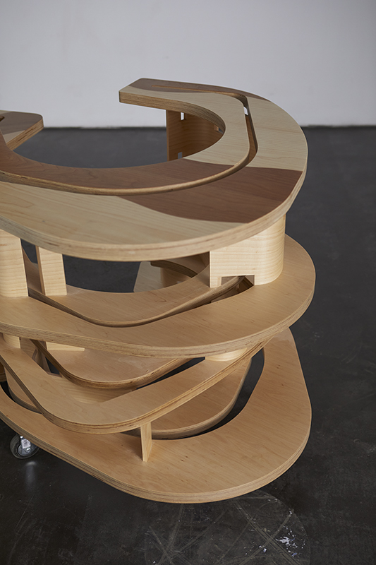 Another piece originally created for Miralles' and Tagliabue's own home, the ‘Tropical’ table (1994) can be adjusted to become a dining or coffee table. For the exhibition, the table was made in American red Oak