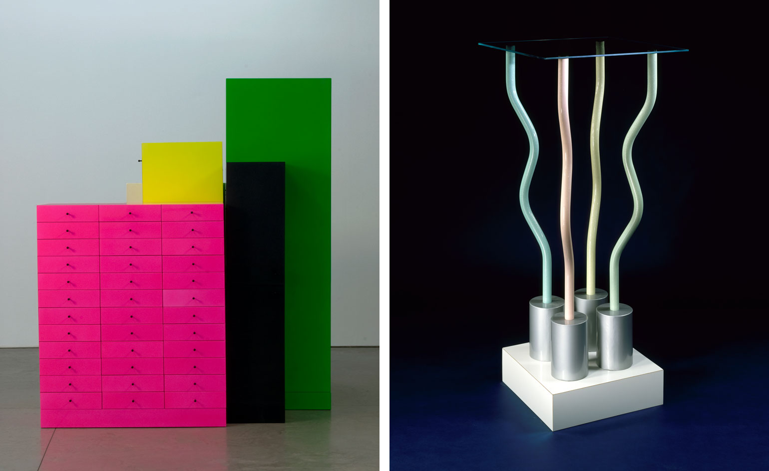 Left, ‘Mizar’ vase, 1982. Right, ‘Ivory’ table, 1985. © Studio Ettore Sottsass Srl