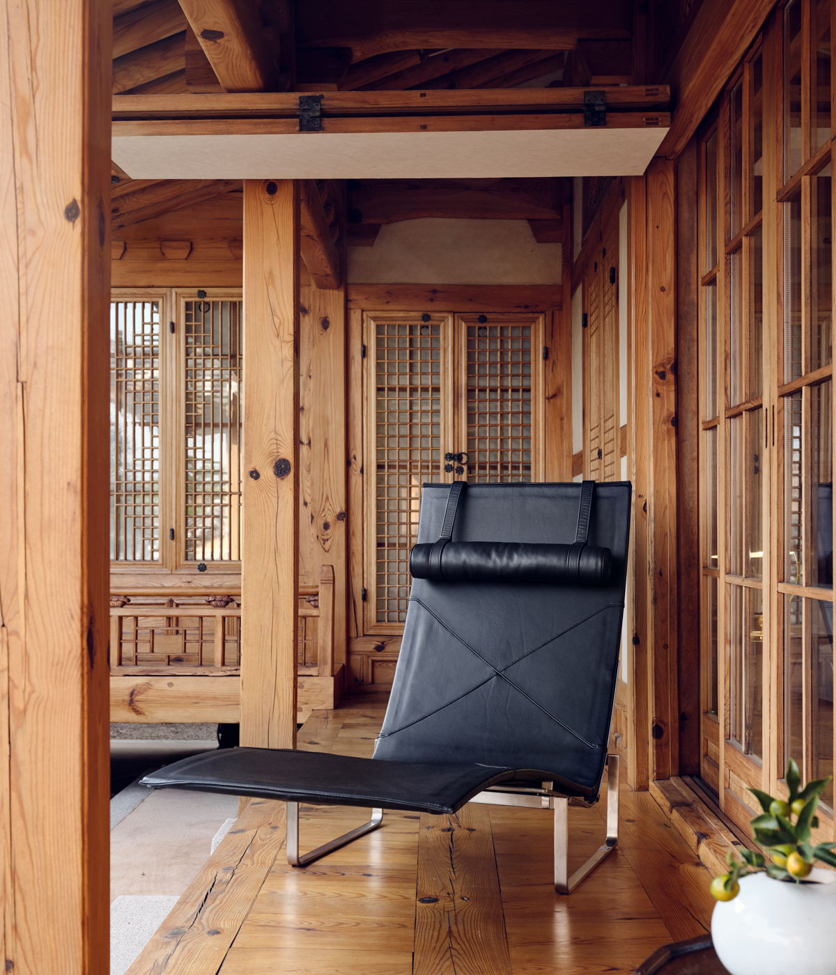 Contemporary and modernist design accents make a chic foil for the traditional elements, with furniture adhering to neutral hues for a feeling of tranquillity. ‘Poul Kjærholm furniture in various places in the hanok is arranged to give a perfect view of the beautiful scenery of Seoul, the peaceful Bukchon Hanok Village and Namsan Tower. Kjærholm’s “PK80” daybed, and a glass “Clam” lamp by Ahm & Lund also gently embrace the space,’ the team add. The pieces sit alongside other design classics, such as Arne Jacobsen’s ‘Egg’ and ‘Swan’ chairs, as well as artworks by Korean artist Heejoon Lee. The elegant lines of Kjærholm’s furniture act as a harmonising presence, uniting the opposing elements.