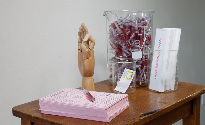 Putting together three installation pieces over three rooms, Sachs called on the talents of Italian digital company Your Voice to replicate human motions in pieces such as a giant table, a chair and lighting. The first room, for instance, contains a red wax chair that faces a metronome. Specially tuned to replicate the beats per minute of a human pulse rate, the metronome transforms itself from a traditionally impersonal object to a beating human heart.