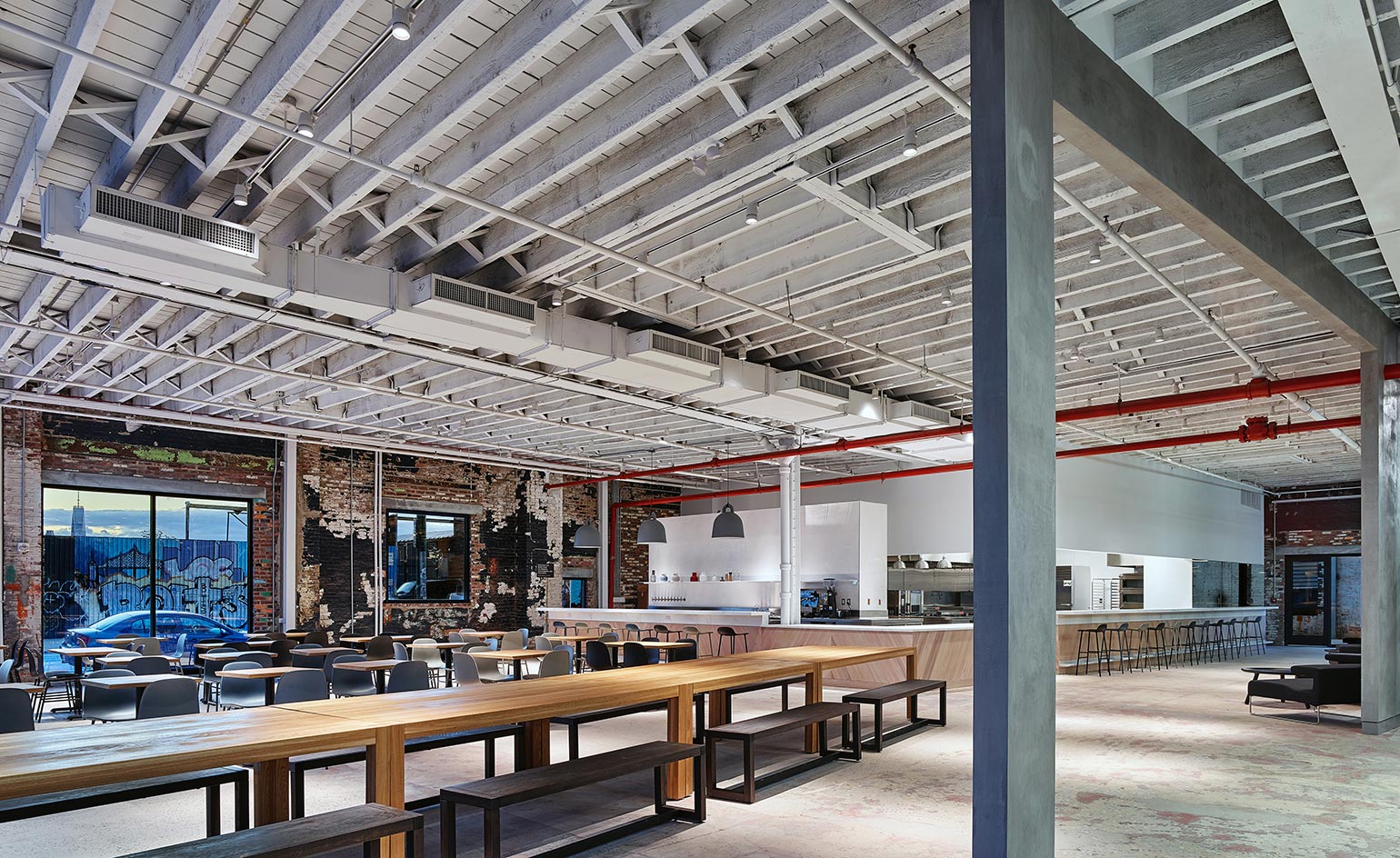 Inside, the brickwork, exposed beams and other original features have been kept in place. Large, street-facing windows have been installed to allow in daylight and to blur the boundaries between public and private space. A signature new structure, the ‘Periscope’, a 16-ft-high prism-shaped skylight made by local Caliper Studio, features mirrored surfaces that reflect the cityscapes in both Brooklyn and Manhattan.