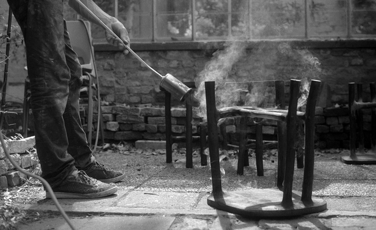 The pieces are burned and treated with wax, after which the top is sanded, polished and treated with oil