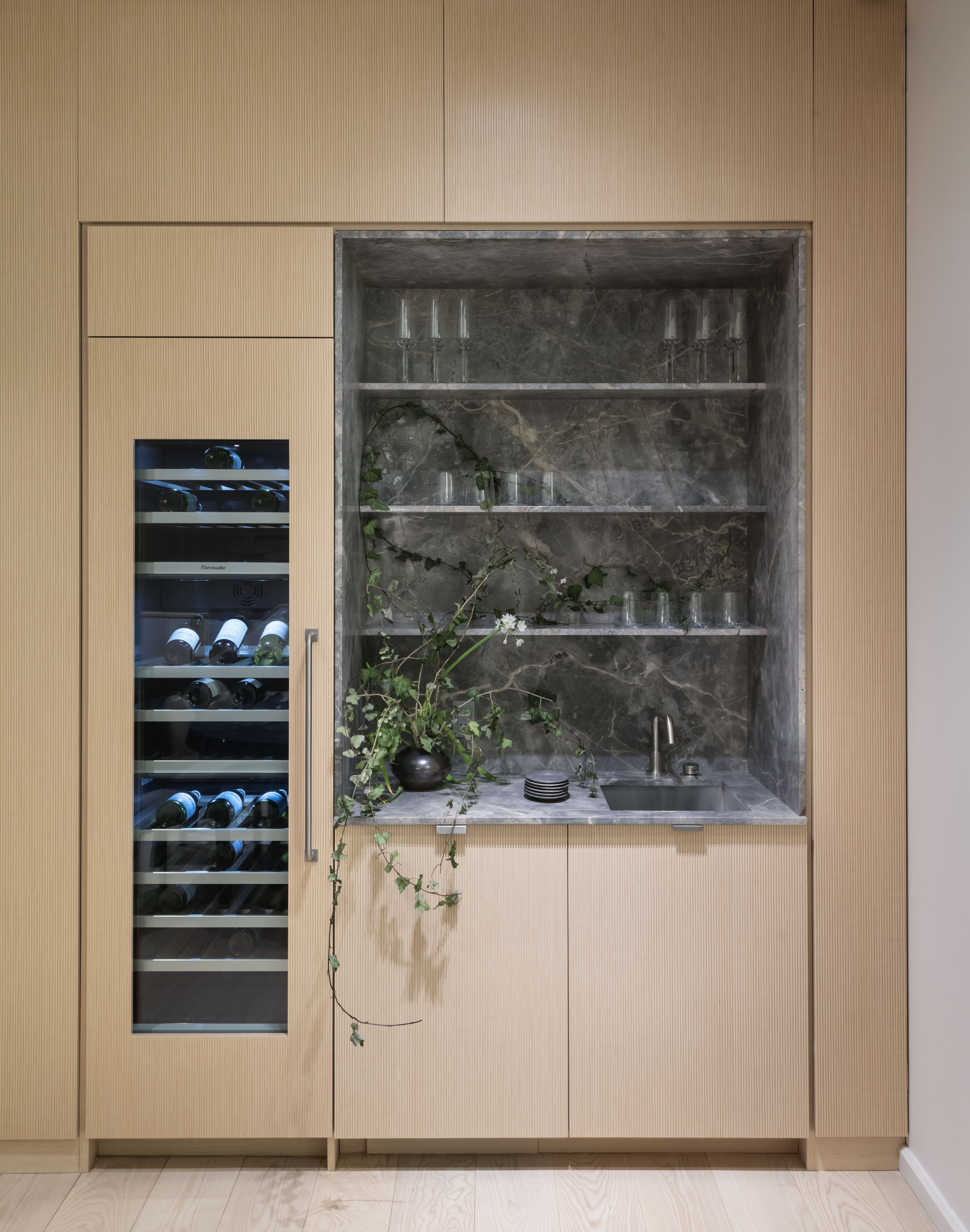 Workstead ultimately conceived the interiors to echo and reinterpret the patterning of the Hill West Architects-designed building façade, which gave rise to the unique residential layouts it contains. The double-height units each bring a townhouse feel to luxury tower living, while full-width terraces make the most of the building’s waterfront views. Open concept kitchens combine marble countertops with textured maple carpentry and evoke both intimacy and grandeur at the same time.