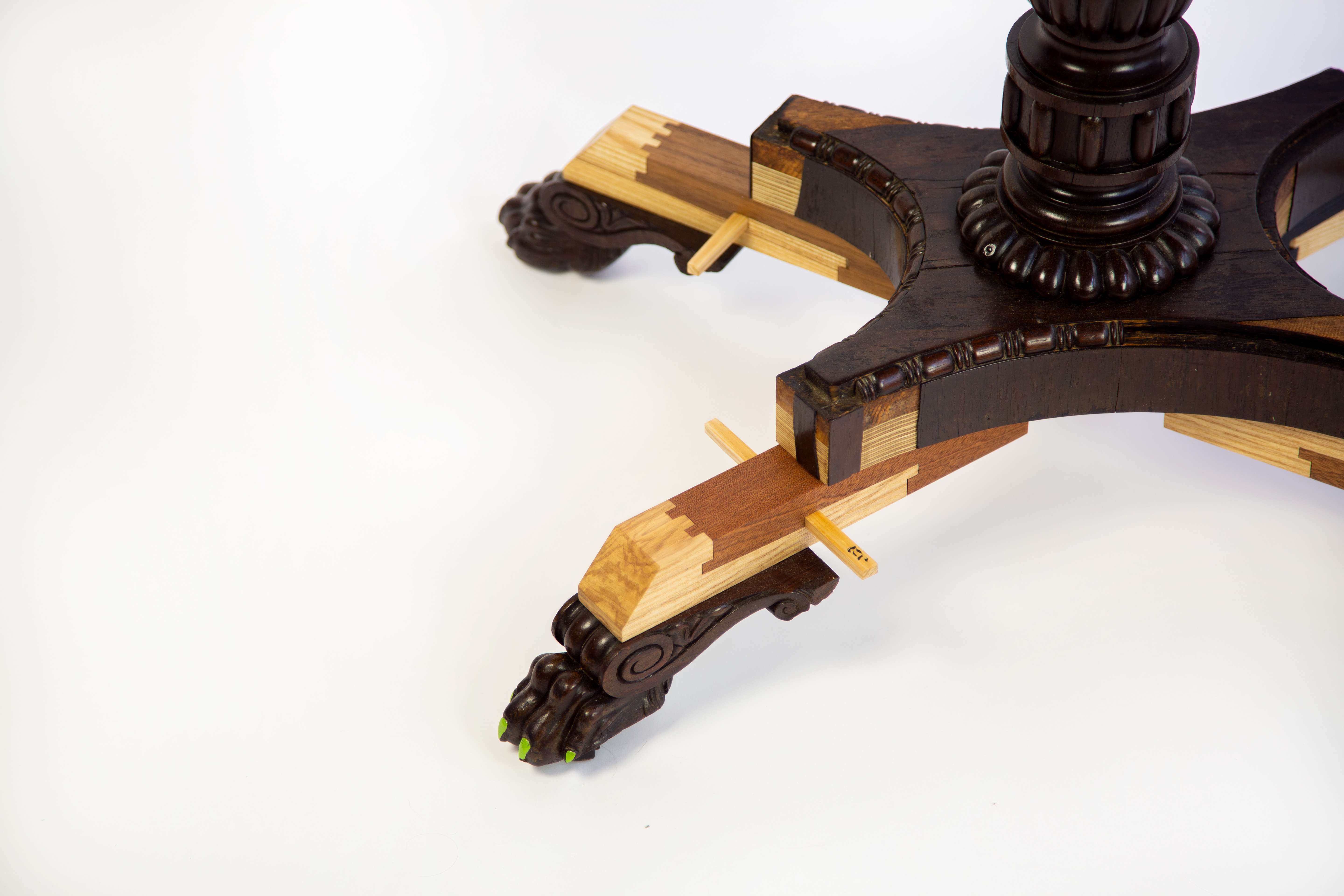 A highlight in the show is the repairs carried out on a sewing chest by Japanese-Austrian designer Rio Kobayashi. The chest was opened up by a woman after her grandmother’s death to reveal paintings, and in turn a hidden dream of becoming an artist. Kobayashi used cherry, sapele and walnut to fix and extend the legs of the structure. ‘I wanted to show the ageing of the piece; it’s already got a story and I wanted to add and repair it with something that could age with it again,’ he says.