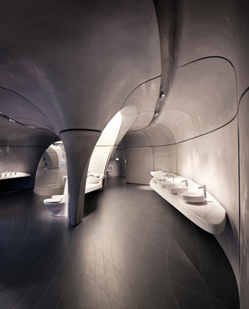From the outside looking in, there is a moment of disorientation as the sweeping grey interior surfaces are interspersed with discrete bathroom sets. The purpose of the space is not immediately obvious, itself a signpost that Hadid's MO of obfuscation and sleight of hand is already at work.
