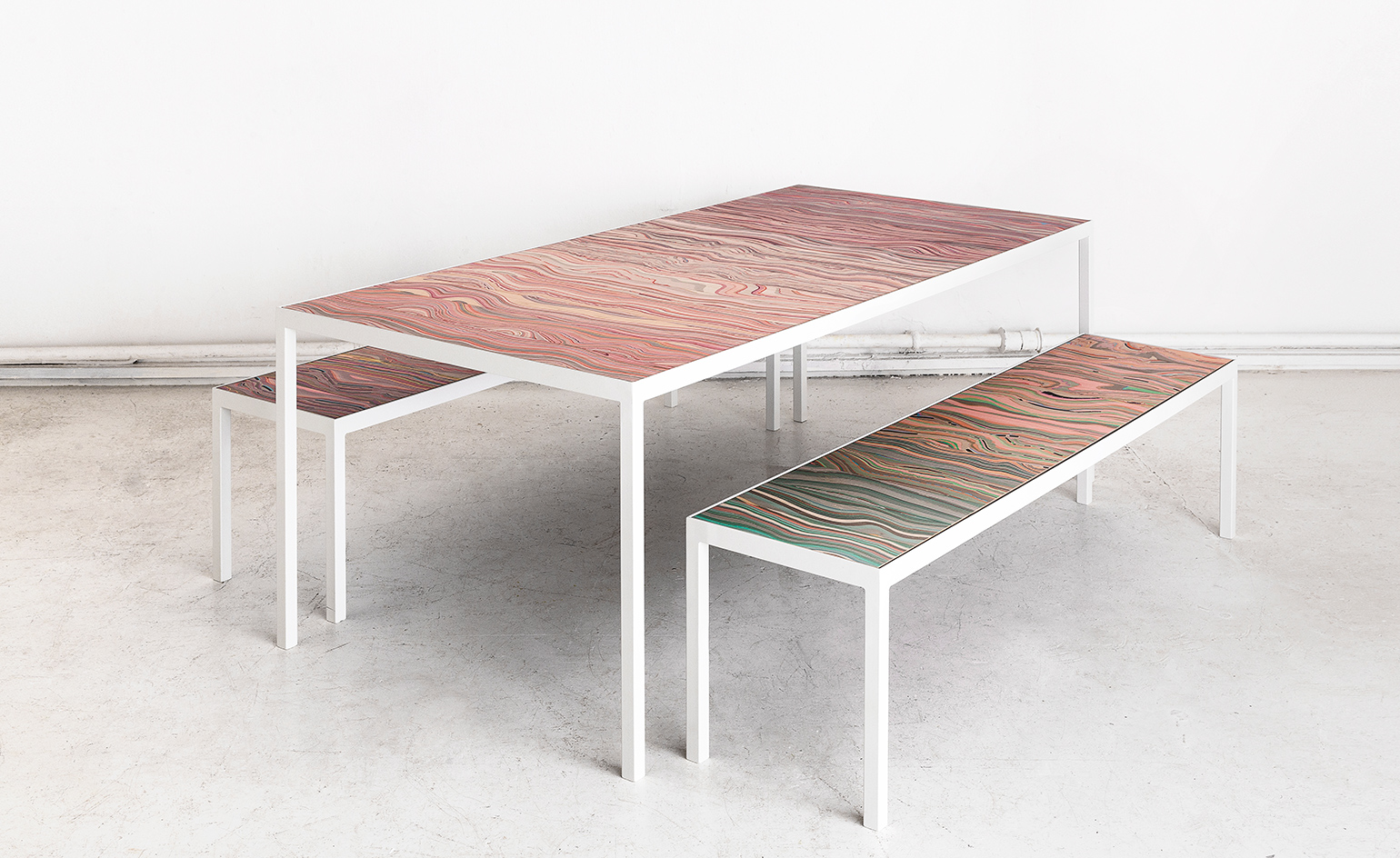 The ’Transition Tables’ (pictured) lure the modern-minded aesthete. ’I wanted their frame to starkly contrast the wood,’ explains Hansen. ’The crisp white lines exude a sleek and tight simplicity against the vibrating complexity of the printed wood’.