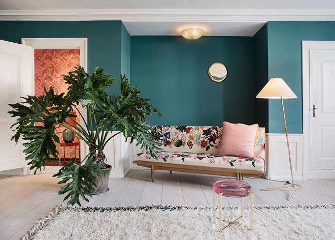 The apartment's interiors have been rendered in a palette of dark, fog greys and muted browns, with leafy plants peppered throughout. Photography: Casper Sejersen