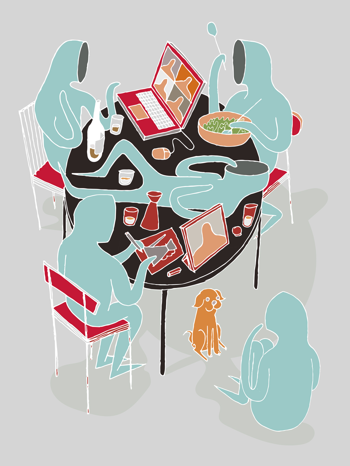 Top, the lines between personal and professional life are becoming increasingly blurred, as seen in this illustration by husband-and-wife duo Vittorio Venezia and Carolina Martinelli of Martinelli Venezia. Bottom, Paolo Dell'Elce's set-up at home, where he is revisiting an old research project on designing for emergencies