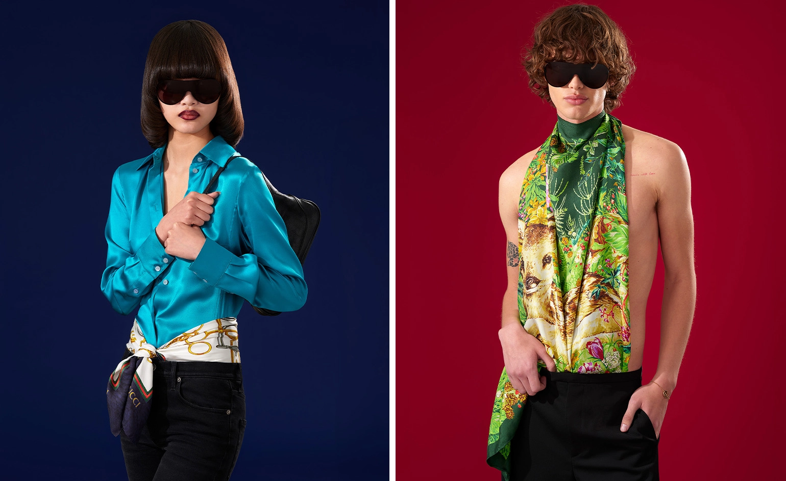 The accompanying ‘Art of Silk’ campaign, meanwhile, sees the styles worn in various ways, including as handkerchief tops, belts, and headbands (‘[the campaign] explores the silk scarf as a dynamic element of personal expression, presenting multiple ways of wearing it’, says Demna via the collection notes). It is the second Art of Silk campaign since the project’s launch in 2025: in April of last year, the house drafted nine artists to reinterpret the 90 x 90 silk scarf, captured on actress Julia Garner in a campaign by Steven Meisel.