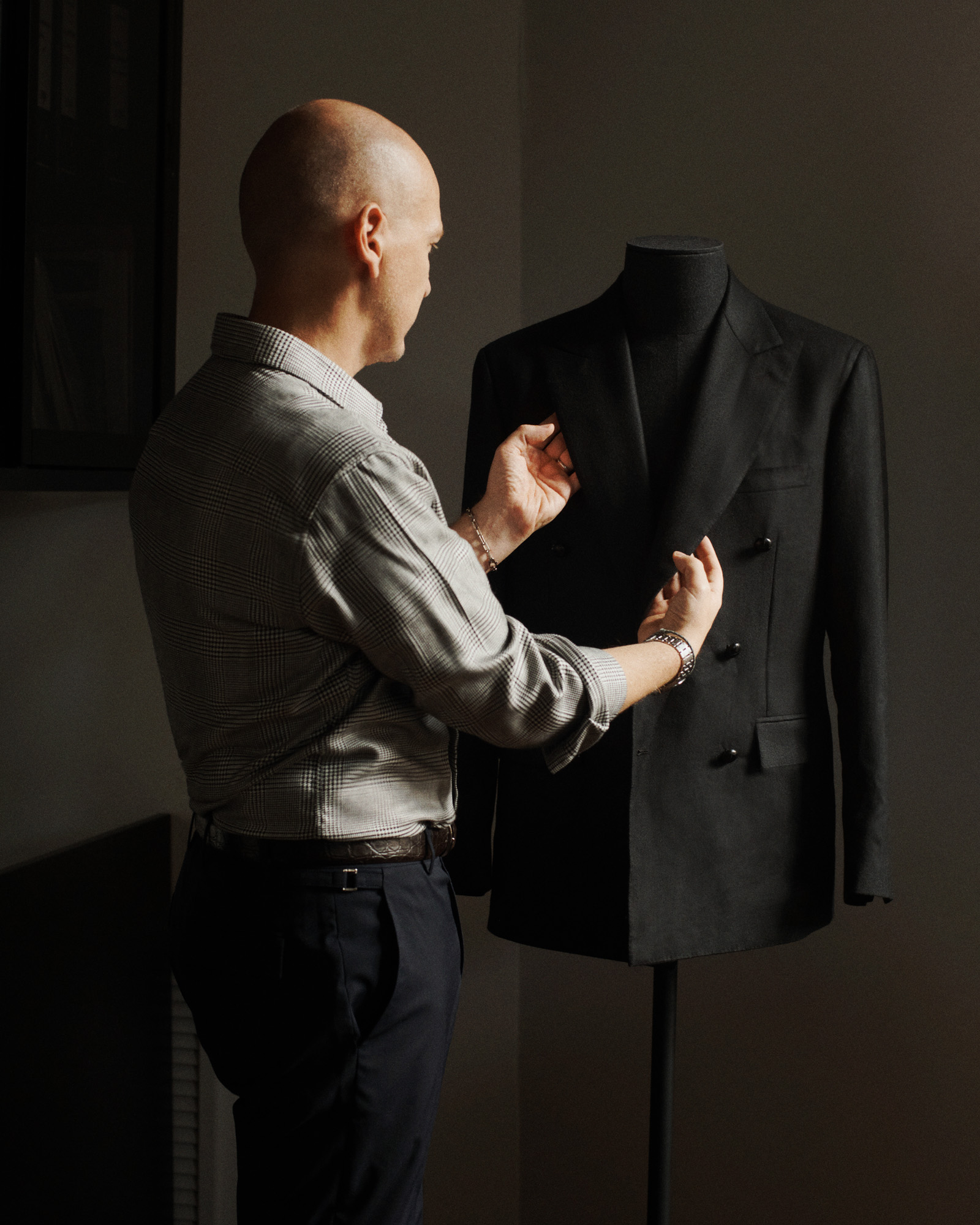 Most of the inspiration behind his collections comes from observing the way that men dress in Milan and on his travels (‘I’m always a bit of a spectator,’ he says), as well as his interactions with clients, ‘listening to what they’re looking for, what’s missing from the collection’. He is also close to Brioni’s high-profile roster of ambassadors, including Jude Law and his son Raff Law, and Brad Pitt. ‘I have a lot of conversations with them because I want them to feel good. Brad Pitt gave me this tip about dressing all in one colour – if you don’t know what to wear, wear a single colour. It’s such an easy trick and something I didn’t have at Brioni before: a matching blue suit, blue shirt, blue knitwear. It just looks fresh again.’
