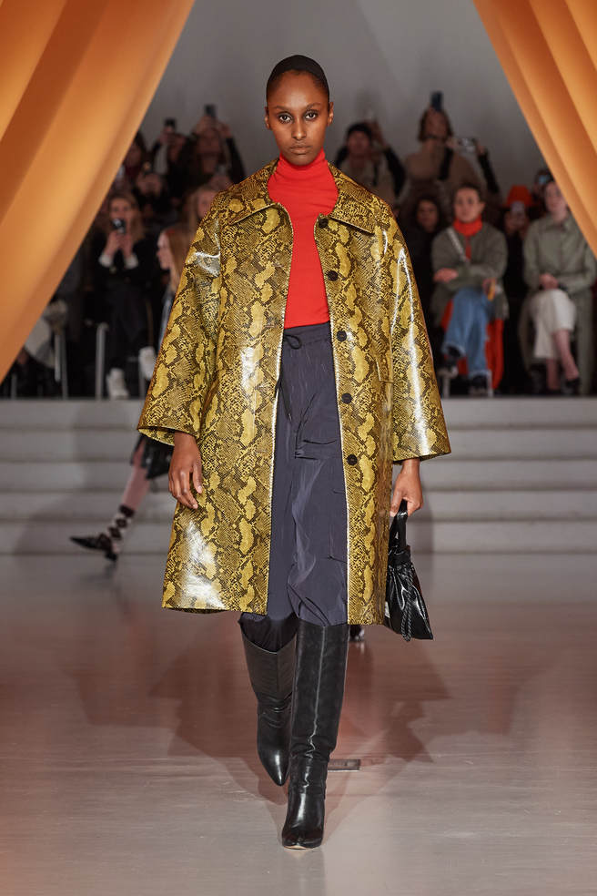 The Ganni girl may be renowned for her floral dresses and oversized embroidered collars, but this winter she’s swapping her billowing silhouettes for cuts that have bite. Printed Prince of Wales tailoring featured inverted lace seams, black LBDs with fringed tassels swept the floor, and suits with a hint of ‘the bar’ were cinched with silver belts. Husband-and-wife design duo Nicolaj and Ditte Reffstrup have put their brand (and arguably Danish fashion) on the map with their take on nonchalant cool-girl separates that have that elusive high-low appeal. This season it manifested most keenly in metallic-coated denim jackets and jeans and glamourous Jessica Rabbit sequins that were countered with double-breasted wool-tweed coats (think Withnail if he made the trip from Camden to Copenhagen), grounded by a footwear collaboration with 66 North. Staging its show at the Arken Museum of Modern Art, the brand introduced a new butterfly logo into its repertoire, created in collaboration with Danish artist Esben Weile Kjær. He has also used the insect as the mascot of his new exhibition in the space.