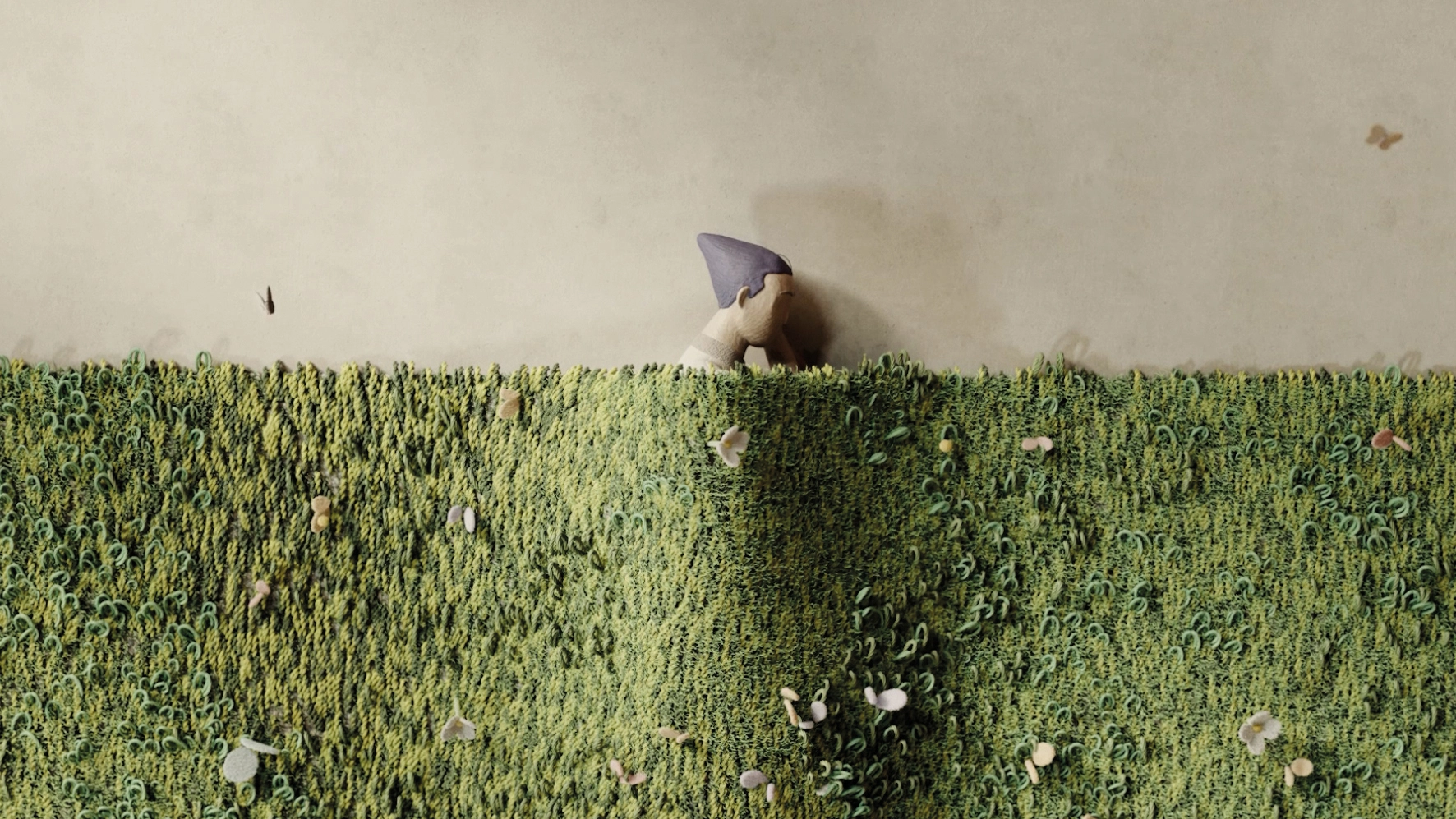To illustrate its vision, Davines has created a series of whimsical, 3D animated campaign videos that nod to its three core values: ‘Growing Through Culture’, ‘Taking Responsibility’ and ‘Poetry of Daily Things’. Each features symbolic ‘Spirits for a Good Life’ – quiet forces engaged in regenerative, poetic acts. In one scene, a spirit mends an arid landscape as though sewing a vast blanket, the earth restored stitch by stitch. In another, bread is kneaded and shared, suggesting nourishment as a collective gesture. Elsewhere, sheets of cloth printed with words are hung out to dry until only the most essential remain – a meditation on clarity in an age of noise.