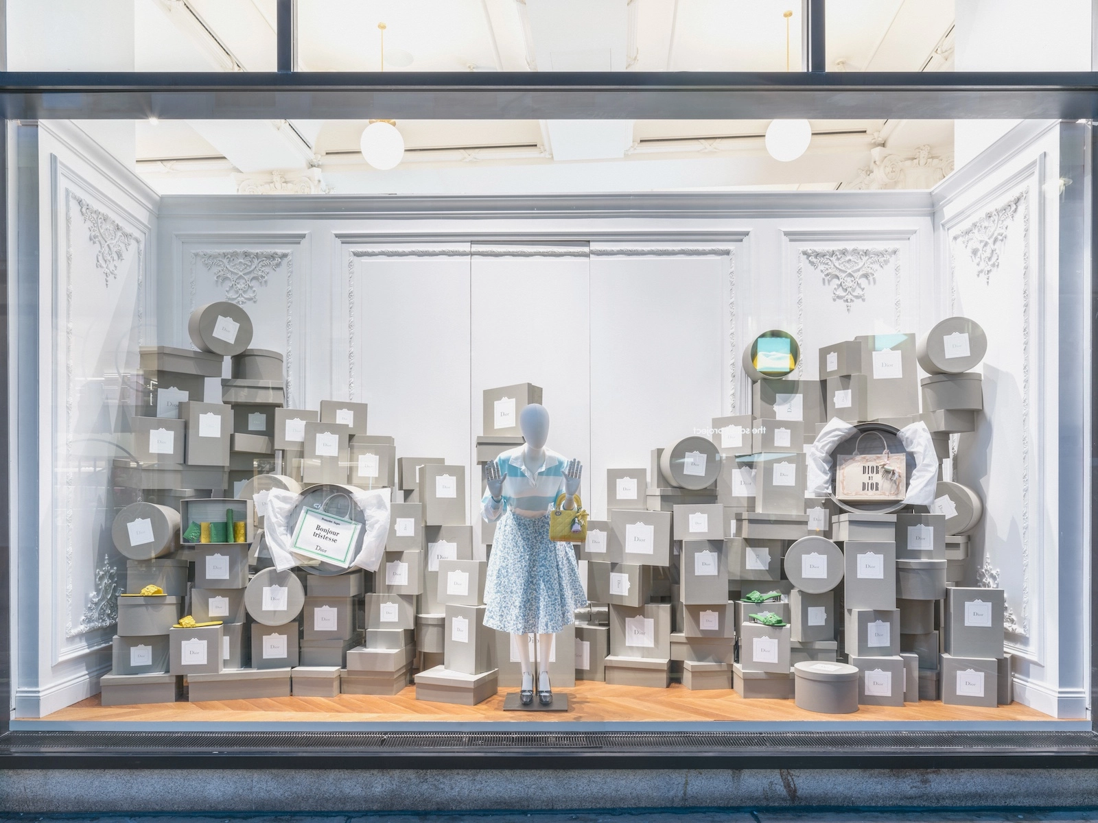 Yesterday (8 January 2026) in London, Jonathan Anderson heralded the arrival of his first collections for Dior (menswear and womenswear, as revealed in Paris) with an ephemeral pop-up in London’s Selfridges department store (the newly installed space takes over the prime ‘Corner Shop’ at the front of the store, straddling Oxford Street and Davies Street). Encapsulating a feeling of both spectacle and arrival, the windows are stacked high with grey Dior boxes – a recently introduced design, imprinted with a de-capitalised Dior logo, which reflects the house’s original 1946 typeface. Inside, two mannequins struggle to hold piles of even more grey parcels.