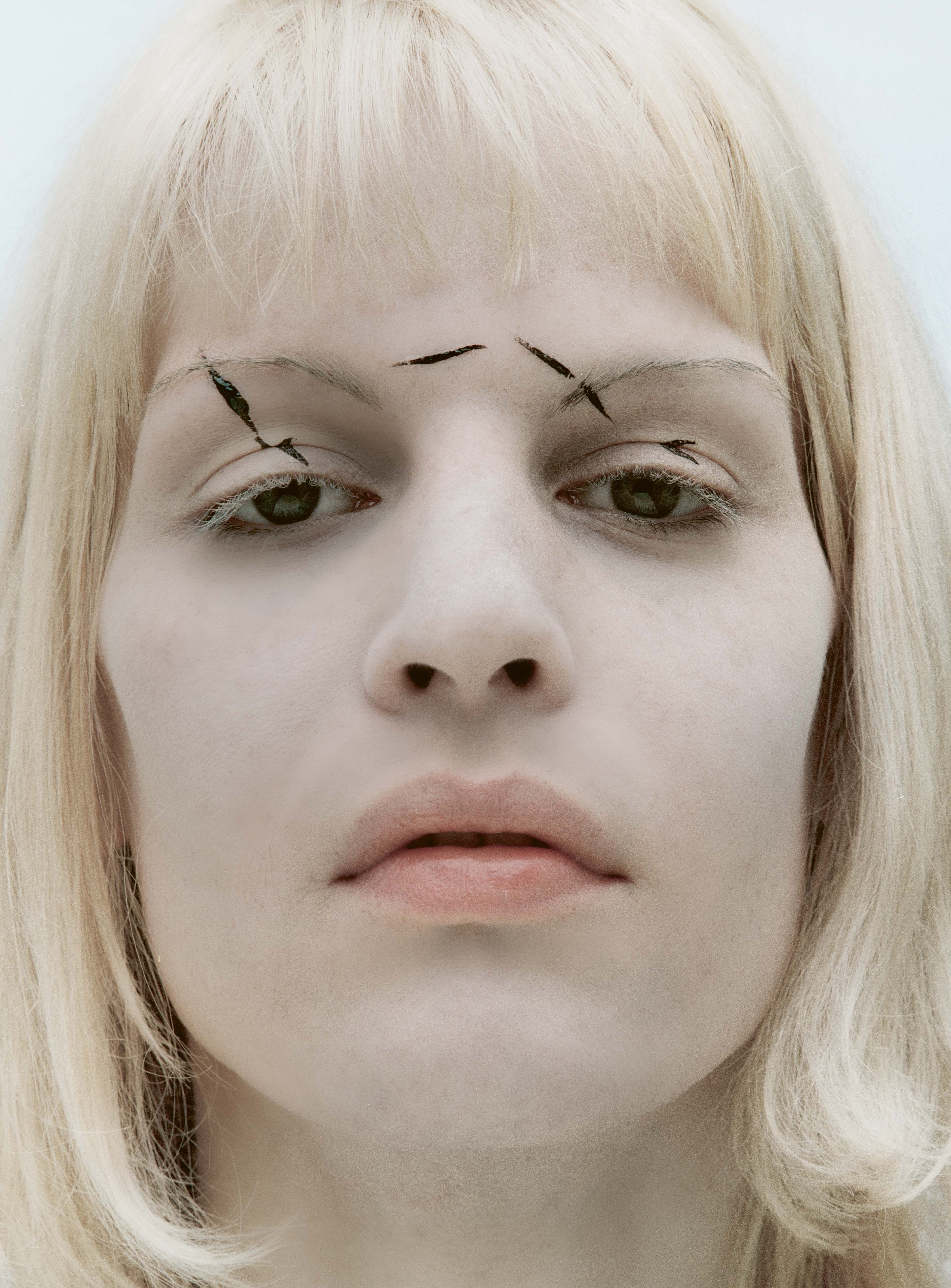 Images show models with a bold painted-on unibrow, or deliberately misapplied mascara, or blanched, monochromatic features. The results are captivating and also challenging; they pose philosophical questions about our perceptions of beauty as much as they titillate our aesthetic sensibilities.