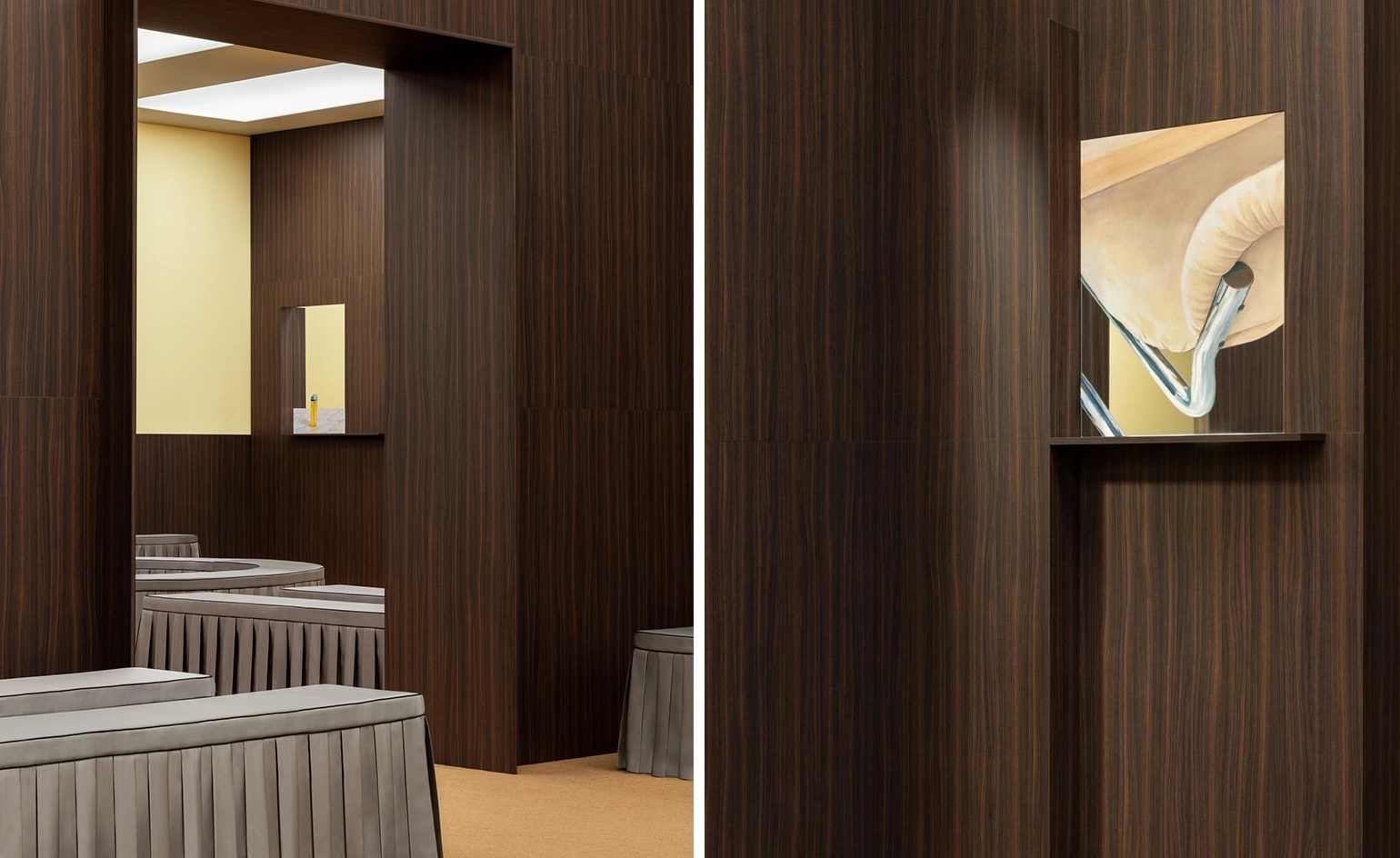 ‘The structure of the set suggests a bourgeois interior wooden frame, hints of domestic architecture – but fragmented, slightly taken apart. It feels familiar yet unsettled, as if a room has been carefully disassembled and reassembled in another order,’ Trimarchi and Farresin tell Wallpaper*. These recognisable elements, resonant yet subverted through scale and deconstruction – for example a monumental doormat covering the floor in lieu of a carpet – were part of ‘a very clear atmosphere’, that Rogge already had in mind for the space when Formafantasma was brought in: ‘something real, unpretentious, open – but without suggesting a specific place’.