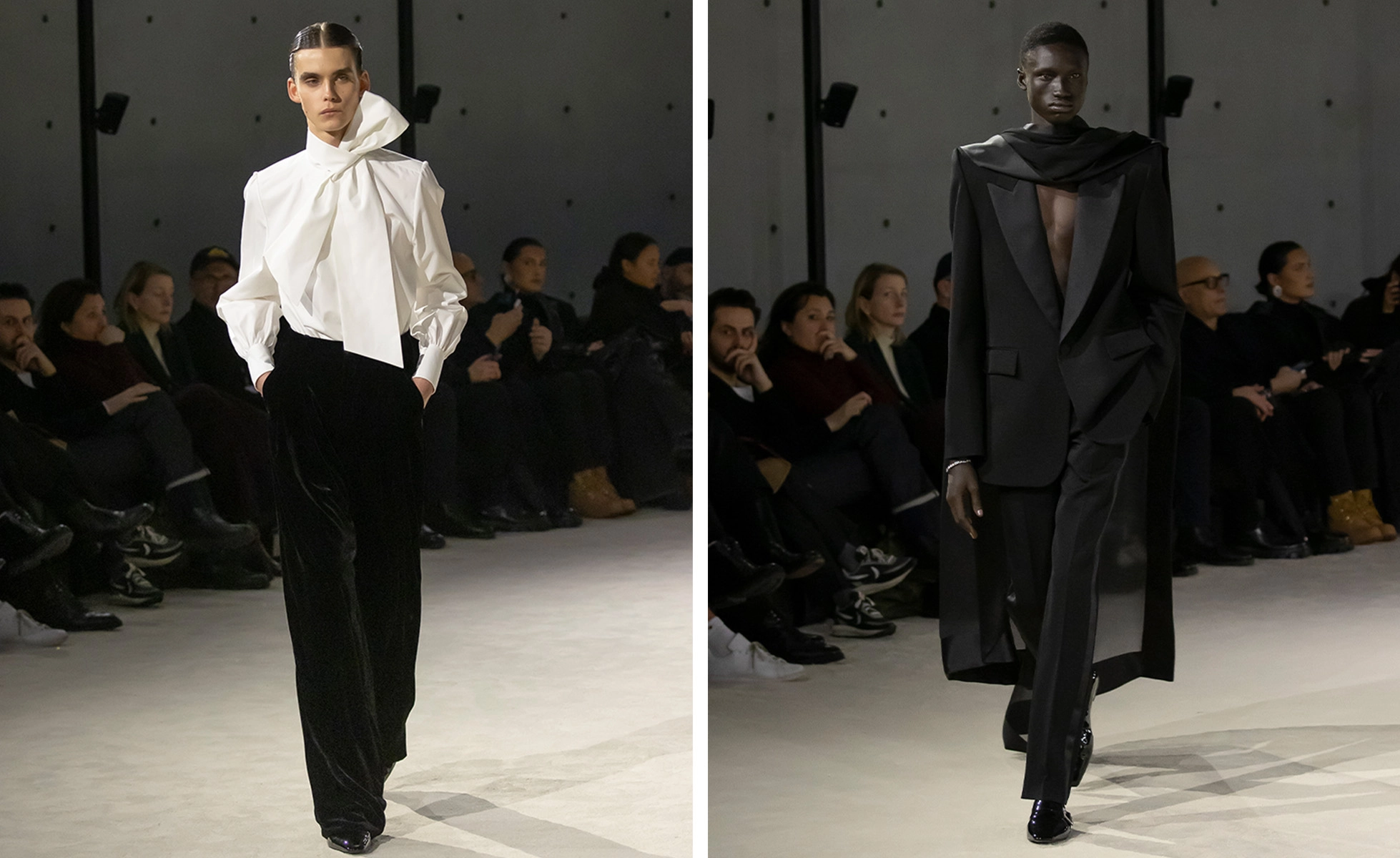 The ‘ultra-focused’ presentation reflected this sense of clarity, following the rigorous aesthetic approach of Vaccarello’s recent menswear collections (the house called it a ‘sequel to preceding seasons’). In Morocco, tailoring was cut sharp and wide across the shoulder, juxtaposed with moments of fluidity, an opposition which continued in this latest outing, which saw an elongated silhouette hardened with ‘assertive shoulders’ and a narrow waistline. Elements of romance – pussy-bow detailing, soft fabrics like mohair, cashmere, satin, chiffon and velvet – met ‘hard-edged’ moments of texture and structure. ‘Each look is considered to a fault,’ said the house. ‘Throughout, the point-of-view is strikingly unified.’
