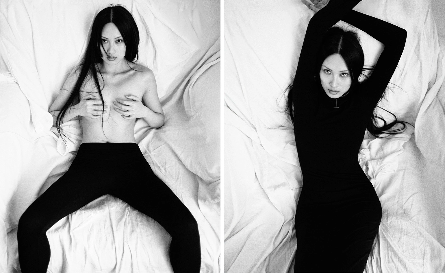 The solution takes its form in a tightly edited, modular four-piece collection, comprising second-skin leggings, a long-sleeve top, a floor-length dress, and a loose scarf with personalised monogram. Every piece is made in the same true black – made possible through Pyratex's closed-loop dyeing process and the natural weightiness and opacity of the fabric – with signature red topstitching. The clothes are slick and cinching, with a nod to the Japanese designers of the 1980s, like Yohji Yamamoto and Rei Kawakubo, who played with what Harlech describes as ‘inky underpinnings, shadow-wear that is this kind of onyx shield’.