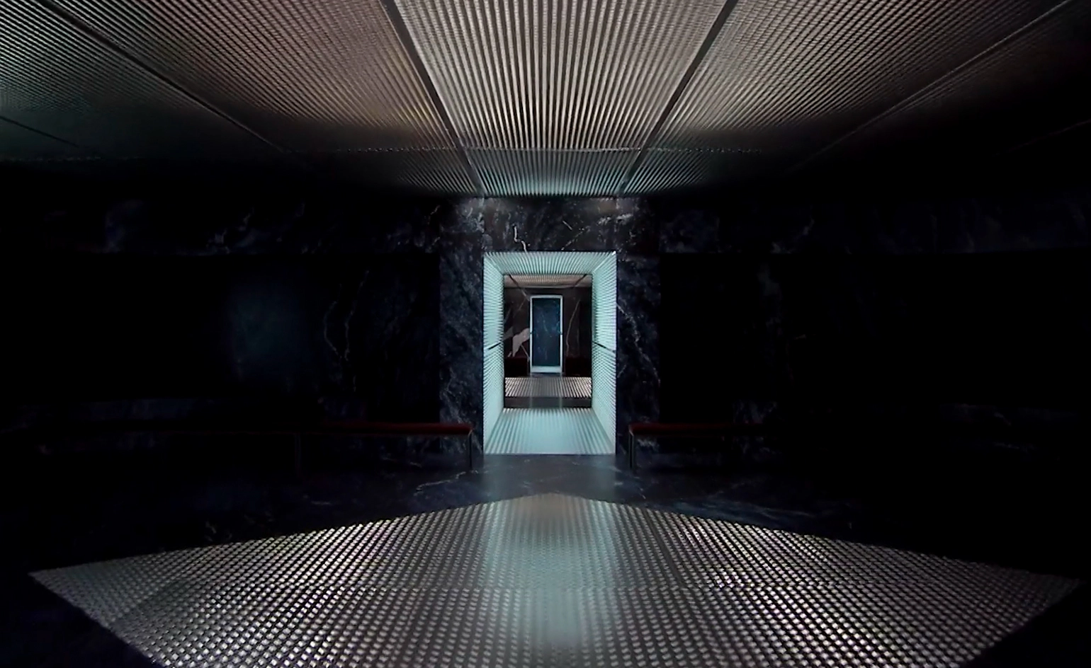 This season for Prada's menswear presentation, Koolhaas' think tank AMO reinvented the Italian brand's Milan HQ as a labyrinth of intimate rooms clad in faux midnight blue and black marble, and accentuated with floor-to-ceiling aluminium tunnels that interconnected each volume.