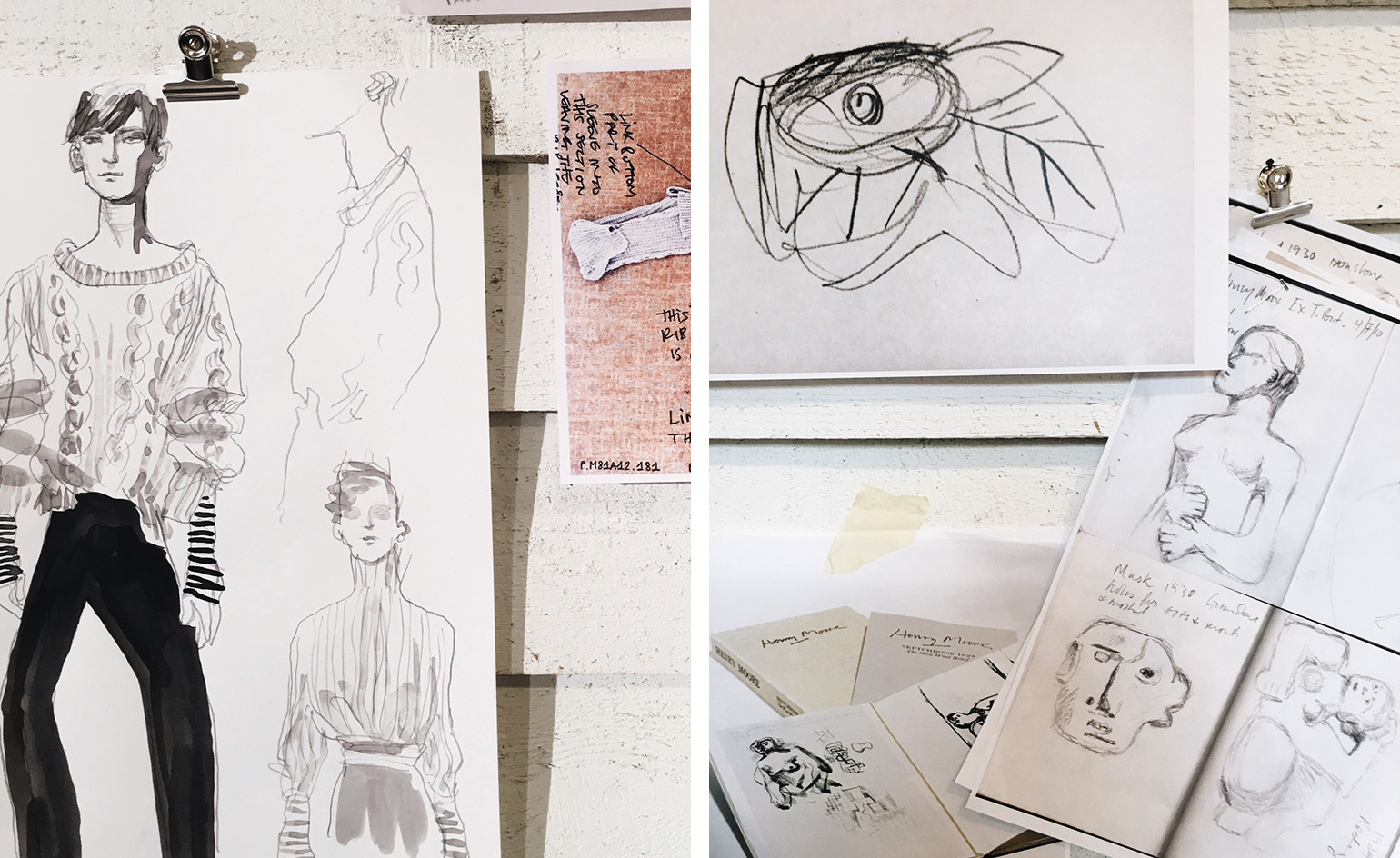 Left, sketches of Burberry’s latest collection. Right, sketches with reproductions of Moore’s drawings and graphic works.