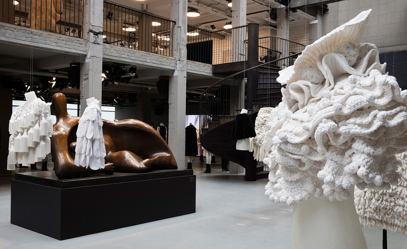 Bailey’s translation of Moore’s asymmetric forms, for example, his Torso with Point (1967), is seen in the hemlines of dresses and sweaters, while his series of intricately formed made-to-order capes in monochromatic white tones, reflect the sculptor’s studies of soft, sweeping shoulder lines. A chunky, cable-knit jumper with a funnel-neck, recalls Moore’s Seated Woman: Thin Neck (1961), while a nude dress with cut-outs at the waist and shoulder echoes the artist’s presentation of hollowed out silhouettes.