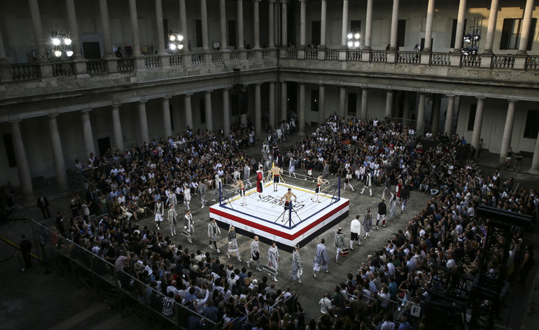 Moncler Gamme Bleu: Designer Thom Browne staged the next instalment of his legendary sporting events for Moncler Gamme Bleu within Milan's Palazzo del Senato. For S/S, it took the form of a boxing match. Dressed in patriotic brand colours, the sparring ring delivered a knockout fashion fight if ever there was one