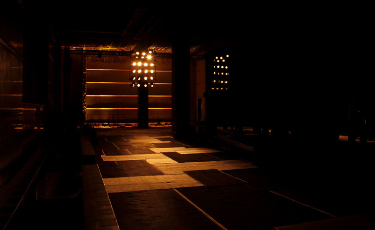 Ermenegildo Zegna Couture: Hollow, geometric blocks created a thought-provoking backdrop for Stefano Pilati's heavily industrial show interior, conceived to reflect the designer's take on architecture and space. American lighting designer AJ Weissbard then cemented the scene's raw feel by adding a misty, sullen lighting set-up that further enhanced the season's graphic, linear silhouettes and muted colour combinations