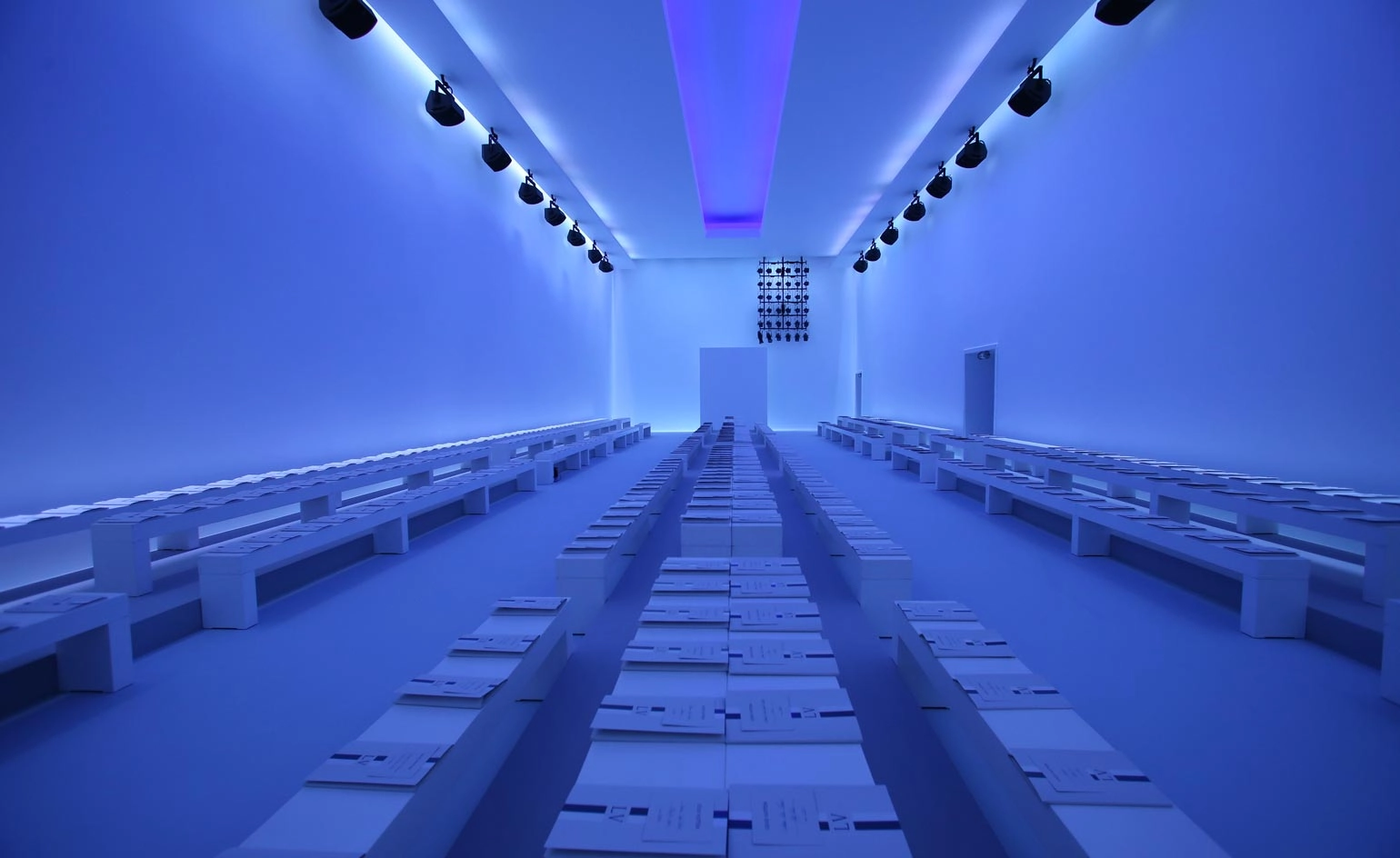 Canali: Calm after the storm was the theme for Canali's spring presentation. Creating a soothing and sterile environment, the Italian brand employed boxed screens along the venue's white-washed walls, which projected dramatic thunder storm scenes at the commerce of the show, before clear skies won out for the finale