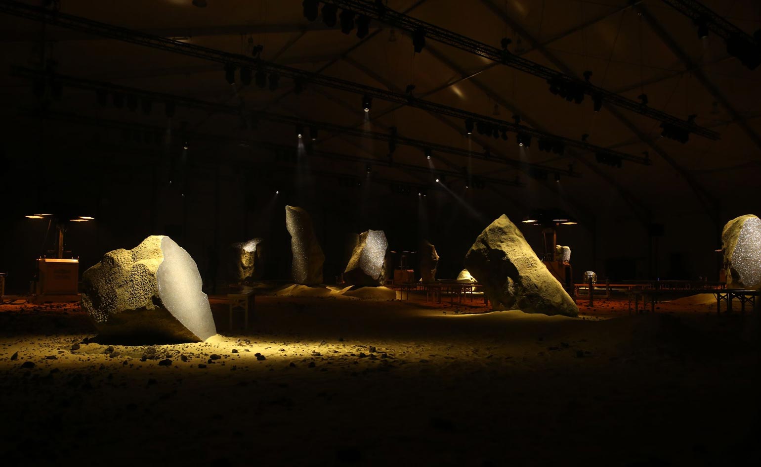 Kenzo: Scenography is always an integral ingredient of a Kenzo show, and for spring we entered into a cavernous space generously covered in sand and punctuated with vintage hydraulic light stations and boulders, or meteors, which sparkled silver